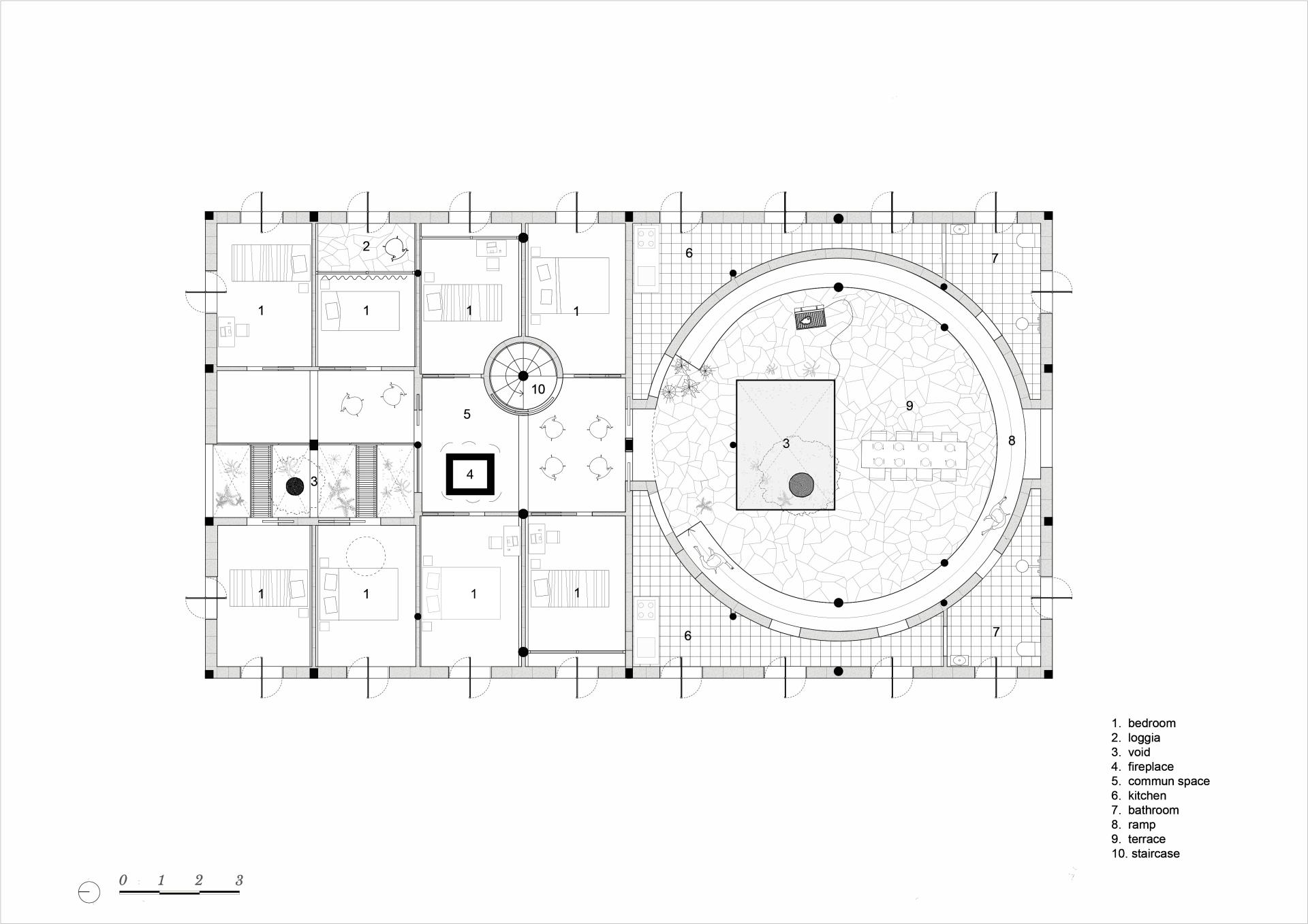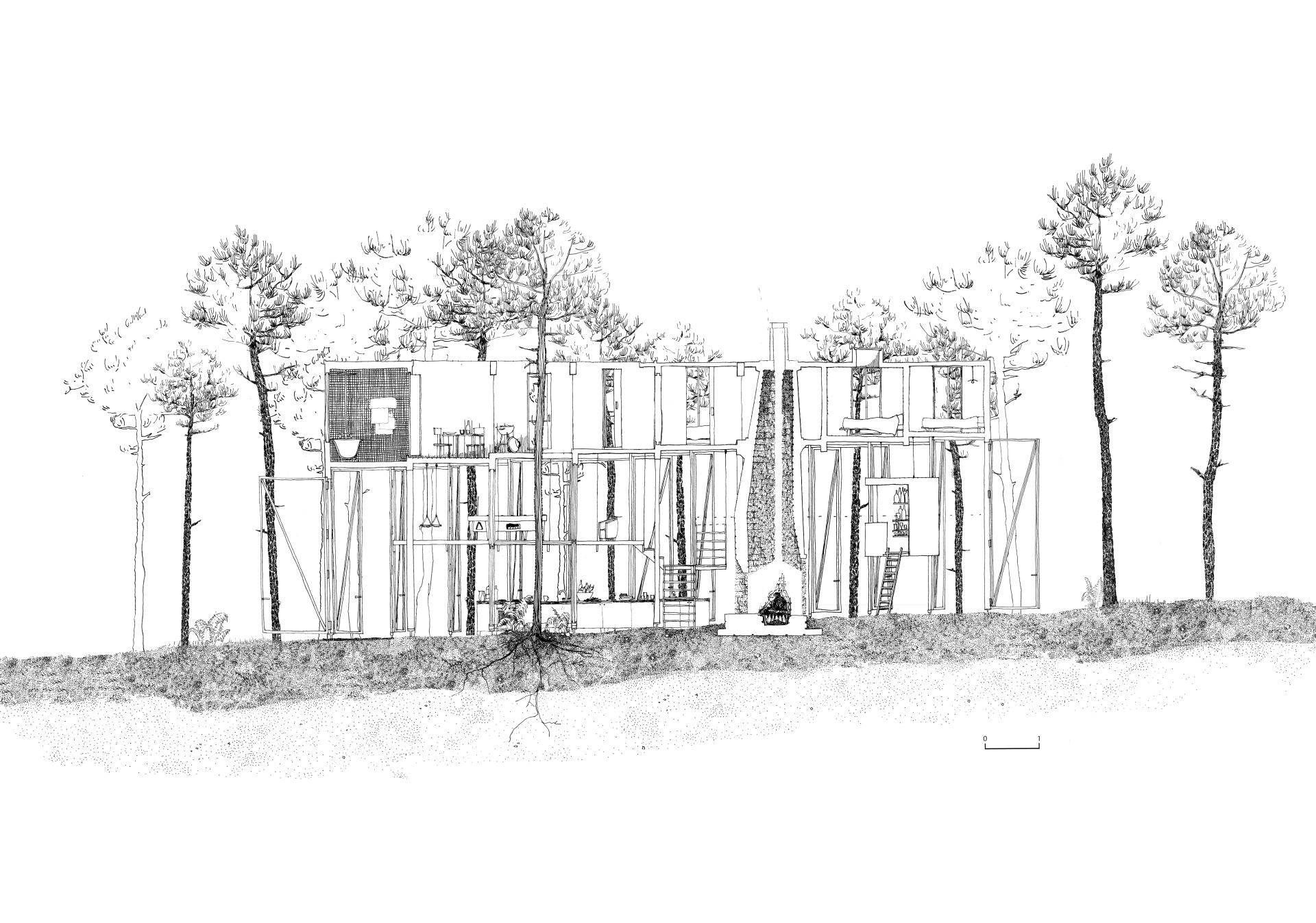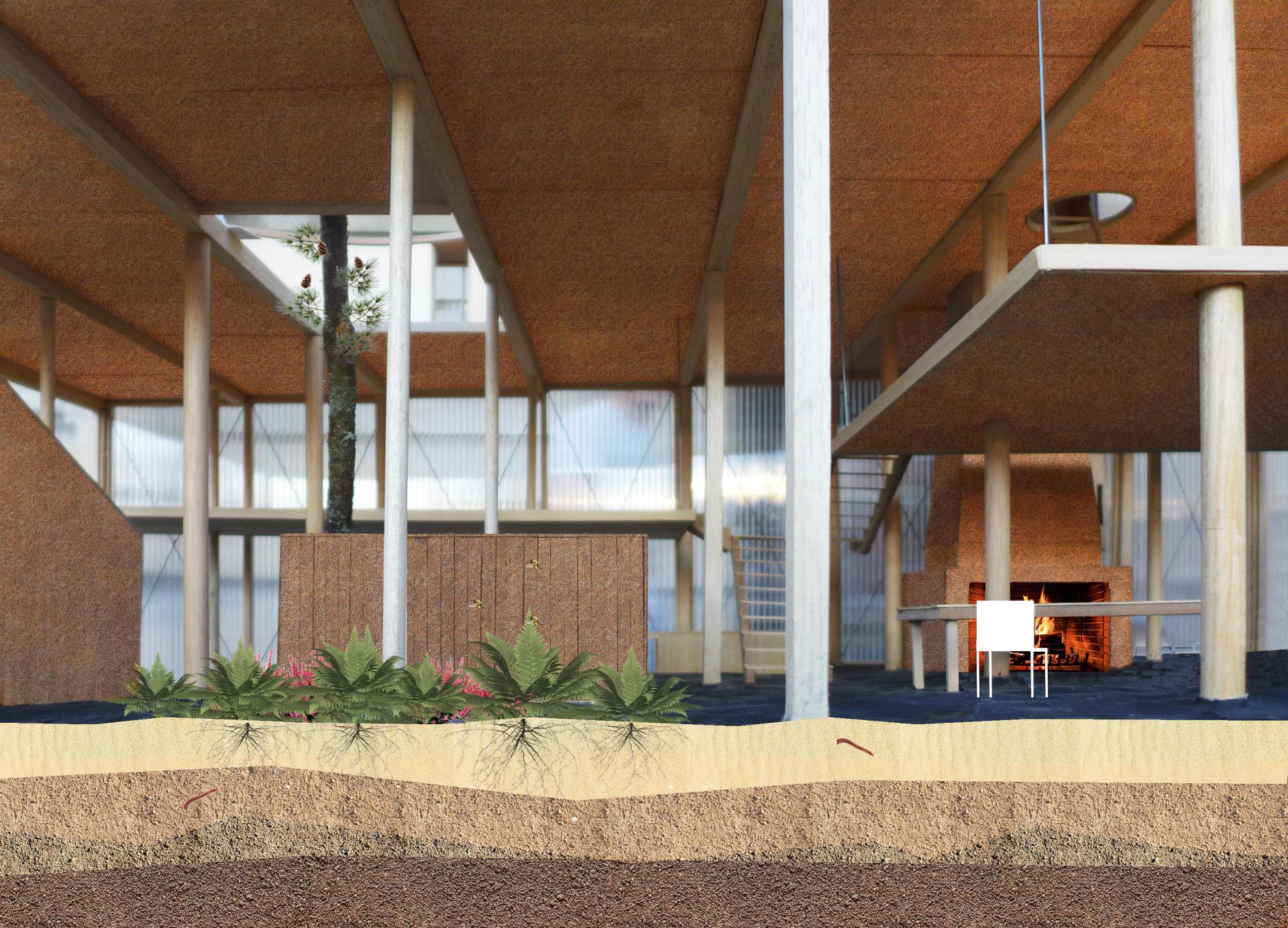 New Landes Residence is a revolutionary residence imagined in SANGUINET, Landes (France). This residence is intended for a small group of friends for a vacations, co-living, and teleworking. This Landes Residence takes place directly inside the pine forest, close to the lake of Sanguinet, and the Atlantic Ocean. It does not eliminate any living earth parcel but composes directly with the rough ground of the existing earth. It is structured as an “all purpose shelter” built with a wooden and local forest pine skeleton. It offers super generous and capable spaces on the low part, and a compact intimacy with private rooms on the upper part. It does not impose any use, it suggests an infinity of possibilities. The residence is an innovative renovation of the old traditional Landes farmer house. It enthusiastically brings back old and forgotten low-tech devices such as compactness, filling construction, fireplace heating, sourced resources, community life, dirt floor, or even the coexistence of human and animals under the same shelter. New Landes Residence is built with an insulating bio sourced concrete made with pine needles picked up in the campsites around the area. This material has been patented since 2007 by a regional mason called DIDIER CUSSEAU, who is currently looking for new development. The collection of the material has a great impact on the environment, it participates in reducing fire hazards in the region and cleaning the forest and camping areas. It suggests new lifestyles in relation to climate, seasons and non-humans. The classical boundaries between inside and outside are erased by large translucent doors that can open in the forest. New Landes Residence embodies inclusion as a manifesto. A suspended ramp allows everybody to come up in the upper part of the residence and gives access to a circular shaped and collective terrace designed for the gathering of the community.