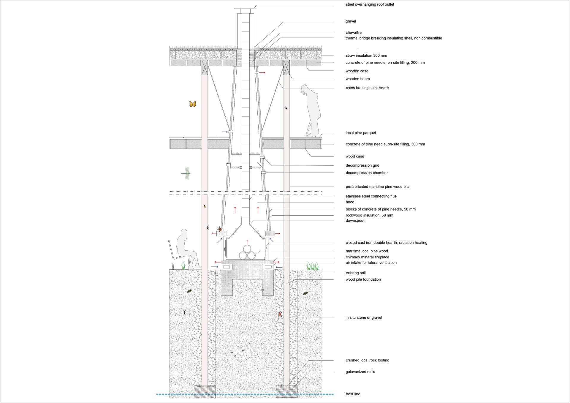 The key objective is to set a wooden pillar forest whose space is generous and that would last over time. In fact, 31 vertical wooden pillars integrate 9 big porticos that are 8 meters high and 12 meters long. They fabricate an “all purpose shelter” whose durability lies in its flexibility. The wooden structure is directly imported from the local sawmills situated less than 10 kilometres from the site in SANGUINET. The structure is dissociated from the walls to fully exploit the characteristics of one ecological and local material: the concrete of pine needle. The key objective is the clever utilisation of this concrete for the slabs and the thermic envelope. This innovative concrete valorises one abundant resource of the region: pine needles. Mr DIDIER CUSSEAU, a local mason, has developed this bio-sourced material as a local alternative to the concrete of hemp, under the name of FISOLAND. The head office is located 95 km from the site, in MOULON, Gironde (33). This is a very promising material which was close to reaching the same thermal performance as hemp concrete λ=0,06W/mK. As an example, by using blocks of 40 cm thickness we obtain a strong thermal resistance of R = 6.6 m² K/W. Moreover, FISOLAND gets a phonic performance of 33 decibels for one 15 cm floor slab and has the advantage to be entirely recyclable after being pounded and mixed with water and lime. Unfortunately despite a good beginning for his product in 2007 and the obtention of several national subventions, this local activity is now declining. Finally, the heating system is a low tech chimney. Positioned in a central space, the fireplace becomes an architectural event that crosses space, connecting the low part and the upper insulated part. It has a central role because it creates a warm and convivial atmosphere given the necessary heat for the bedrooms. It is economical and ecological because the site takes place in a forest region and trees absorb CO2 during their growth.