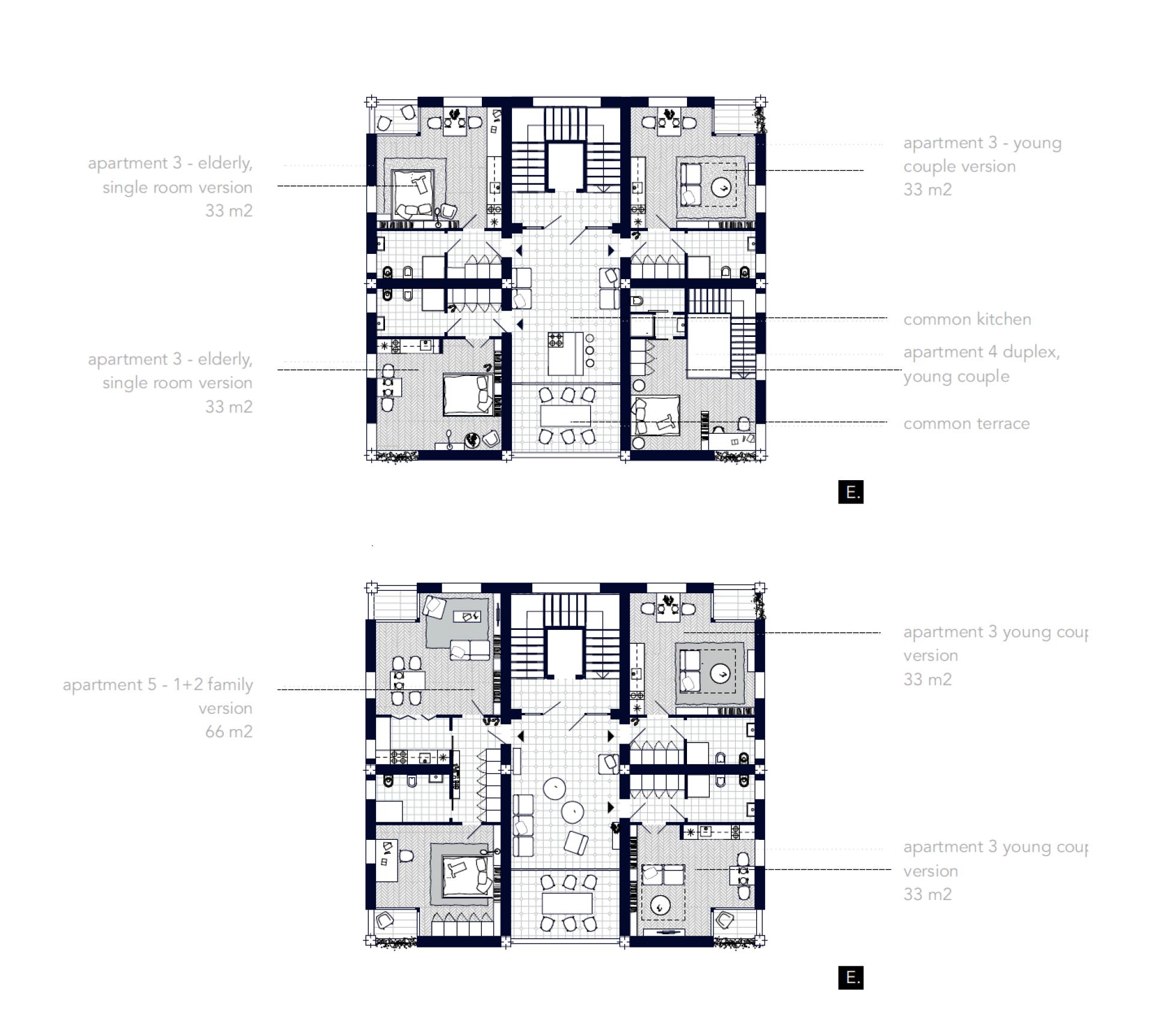 Organization of buildings should make it easier to interact with neighbors due to shared spaces on the ground floor or intimate courtyard and so for elderly (but not only for them) it could be more simple to establish community and not to live alone.