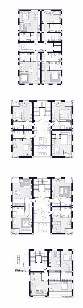 Each building proposes unique apartments and a way of living. Some of them are designed as cohousing, some of them as more independent living. Effort was to always have the possibility to flexibly adapt to different situations. Some of the apartments are designed as smaller with common areas however can be easily changed into bigger, if the investor/user wishes. Providing this diversity was very important in order to reach different users and not to exclude some possible users.