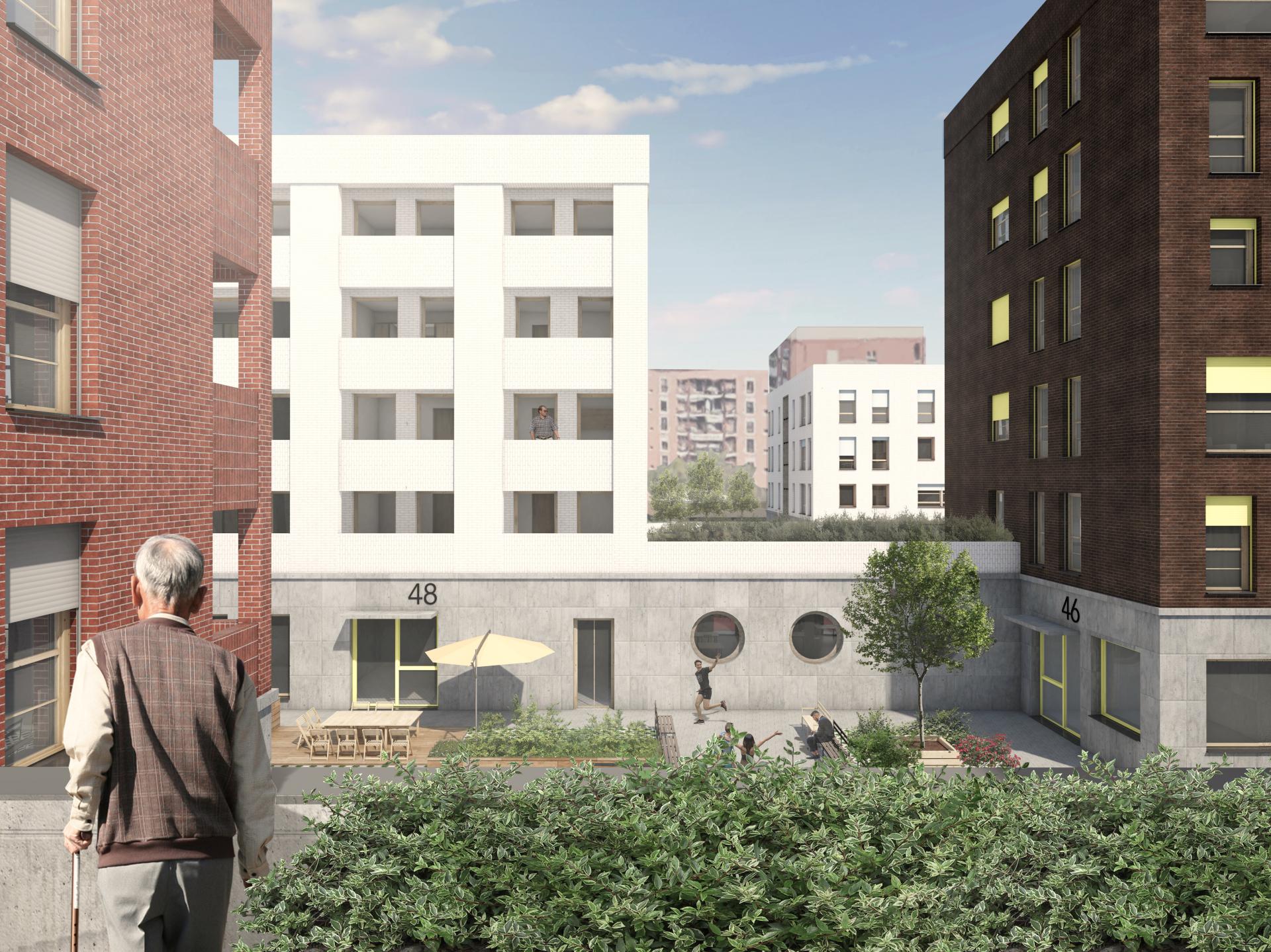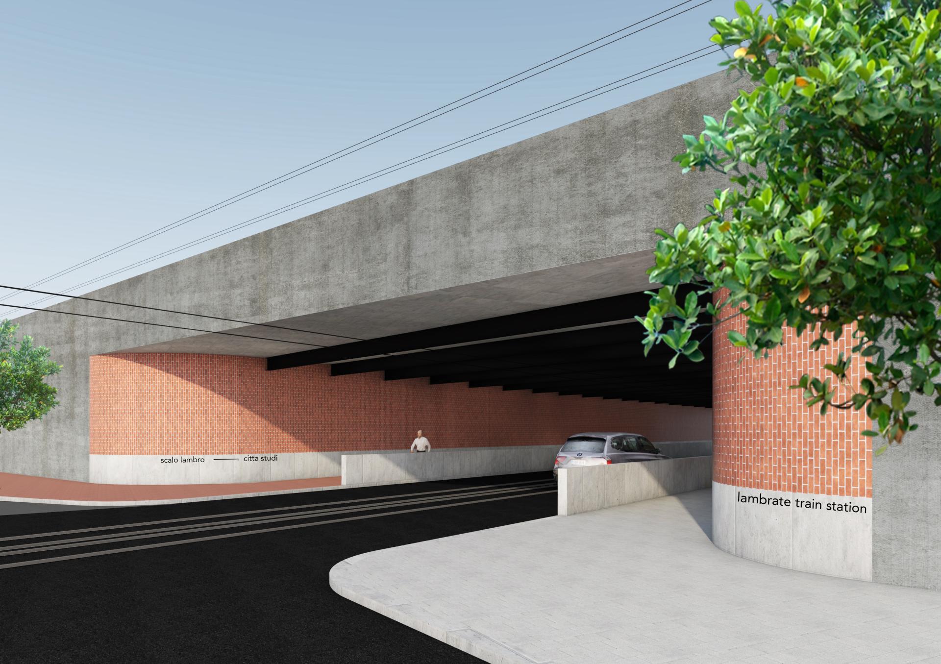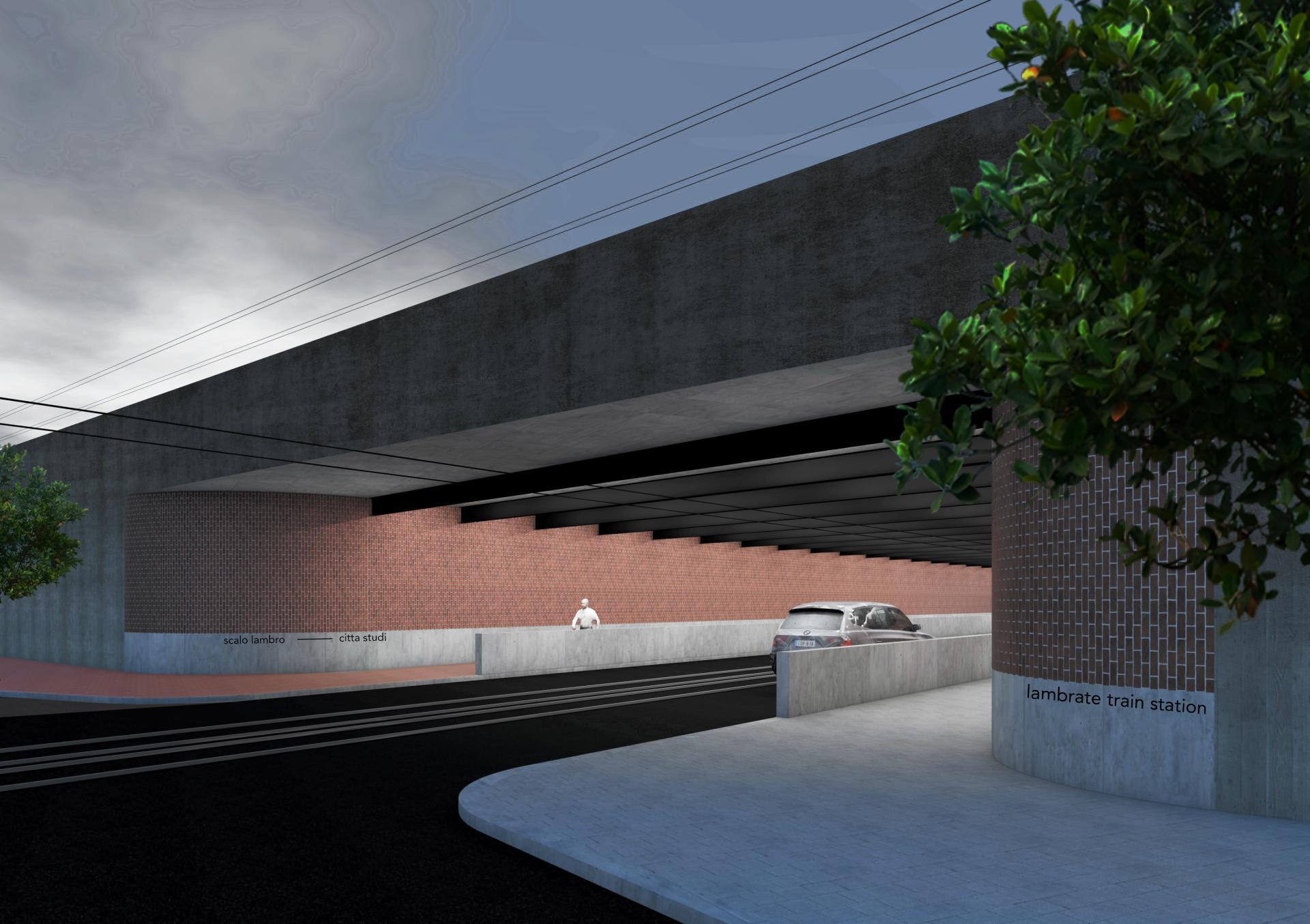 Lambrate neighborhood is known for being clenched by railway, highway and river Lambro. My area takes place along the underused railway yard, where at the moment a huge supermarket takes place with many abandoned industrial buildings. My concept is based mainly on working sensitively with already existing elements and features of the site. Apart from existing building that are kept and transformed, one of these elements is a long wall framing the area from the tunnel which I decided to keep, only perforate at some points. I recognize that as an element worth preserving due to memory of people and in order to support already existing biodiversity in it at some points. I am delicately creating shortcuts in between existing buildings from the main road to my forgotten site and there I am proposing inclusive housing consisting of 7 free standing buildings, at some points connected in ground floor, with inclusive and flexible apartments and multipurpose public space.