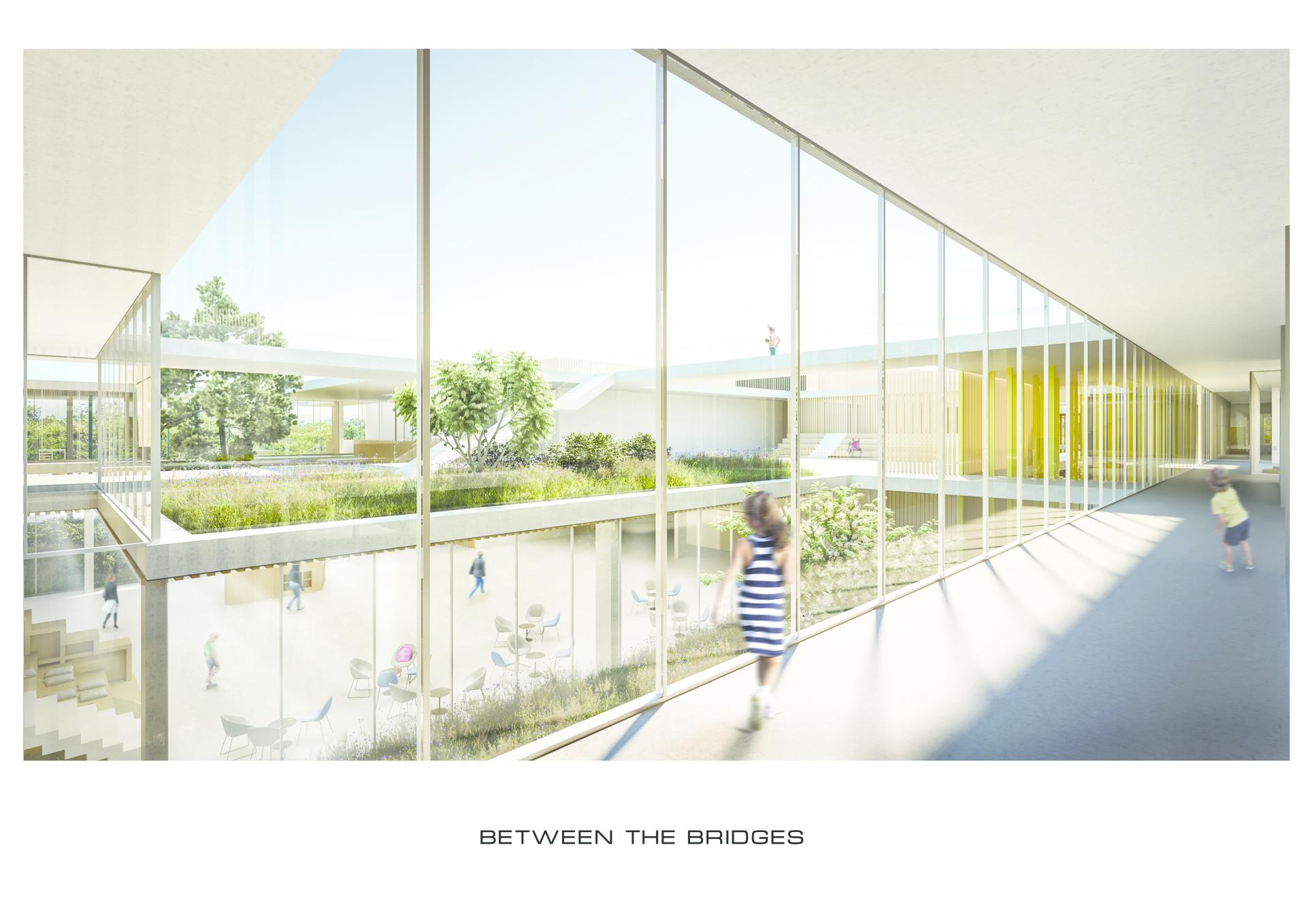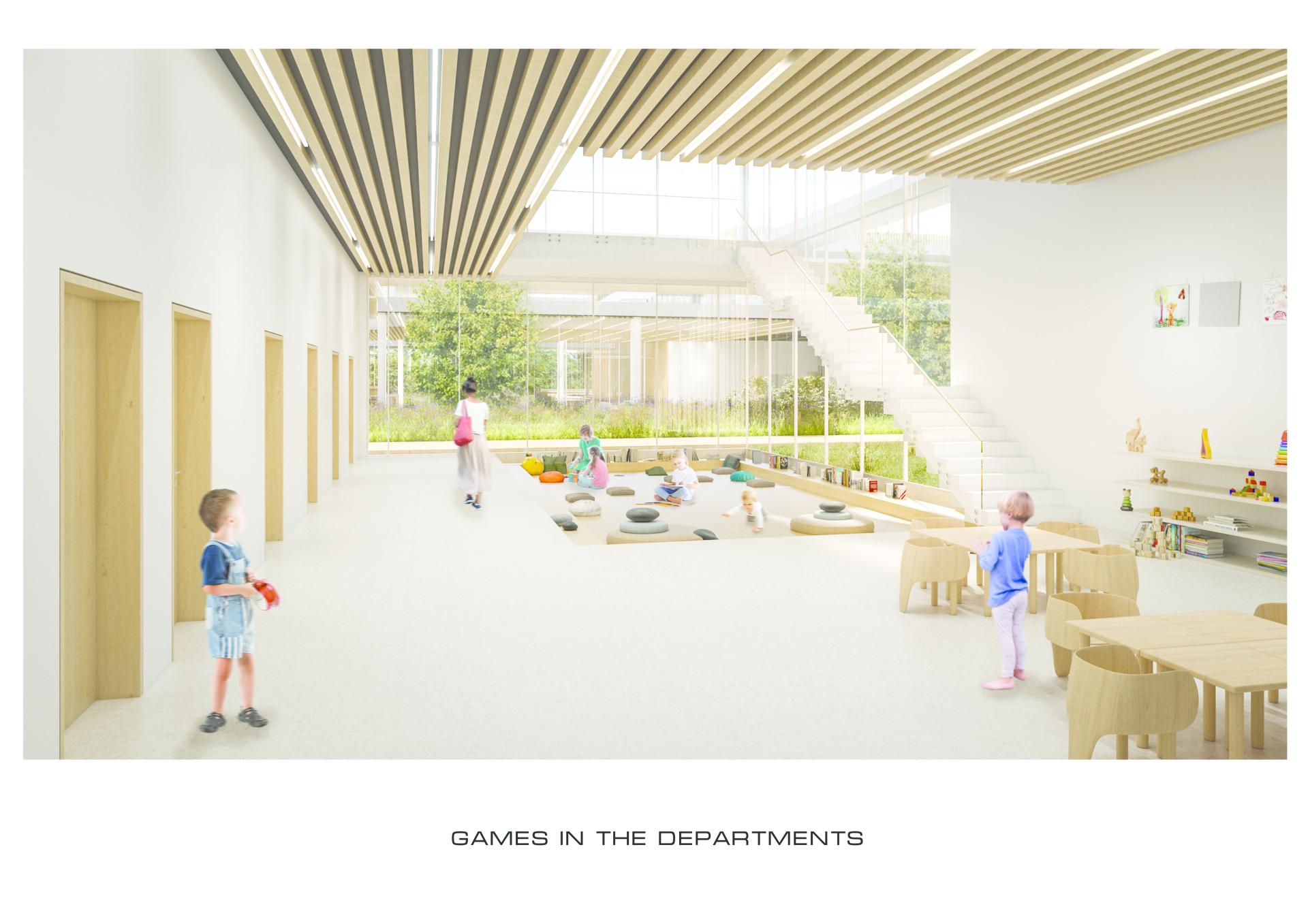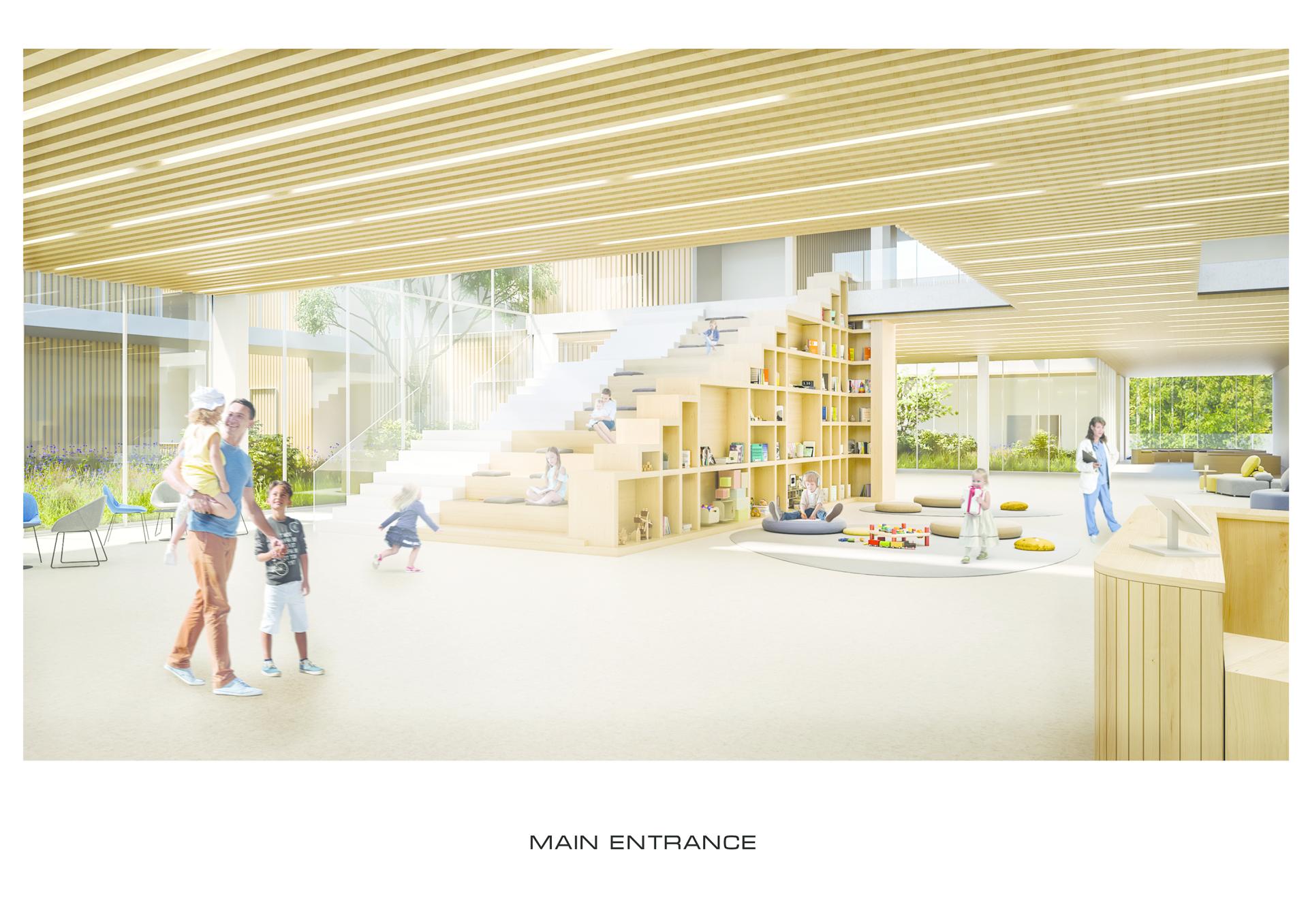 A feeling of home and coziness can be felt in each of the wards, as outside the hospital rooms are formed common areas for eating and playing, again overlooking the surrounding greenery, the goal is to encourage patients to get out of the hospital bed, which helps to their recovery.The picture of the main entrance clearly shows the escape from the hospital corridors. Here they take your gaze to courtyards, pass through play areas and create a system much easier to navigate and naturally lit. The entrances are separated for the emergency unit , outpatient clinic and reception and for the physiotherapy and rehabilitation unit and all of them are on the face of the building easy to recognise by the coloured columns in front of them. The choice of wood as a main material comes as the most natural solution. Which strongly emphasizes the idea of the building. It is implemented both in the exterior and in the interior, which complements the feeling of comfort that is created. All this elements (courtyards, play areas and pleasant common areas, small scale, colored columns, wooden lamellas, green roofs and bridges) strongly influence the mood and feelings of a child, respectively his healing process. In this way, hospital design helps to treat patients and fulfills the basic meaning of architecture - and that is to work for the benefit of people.