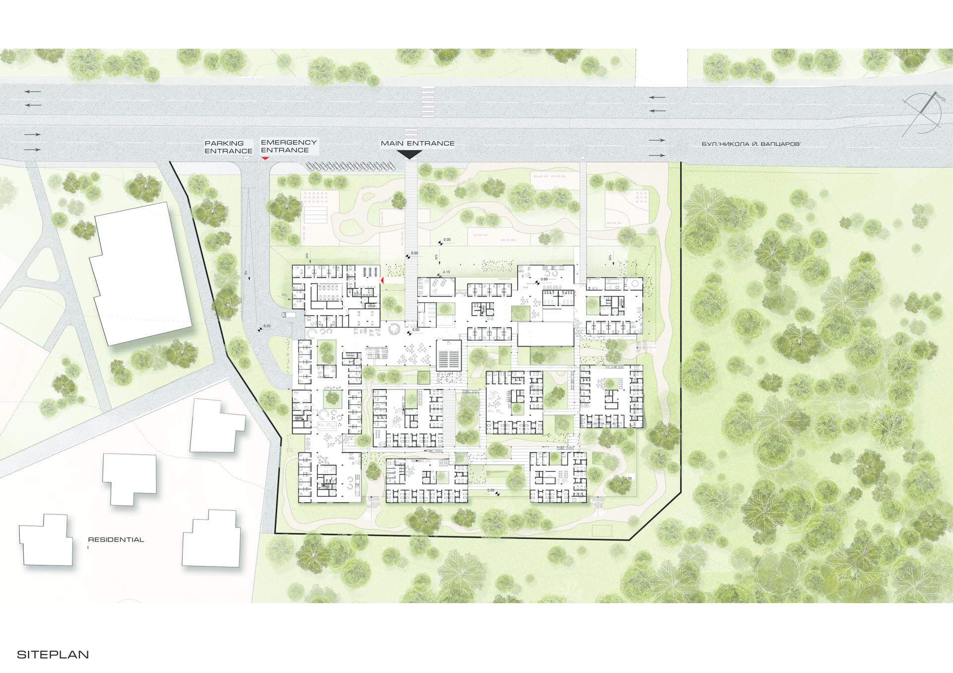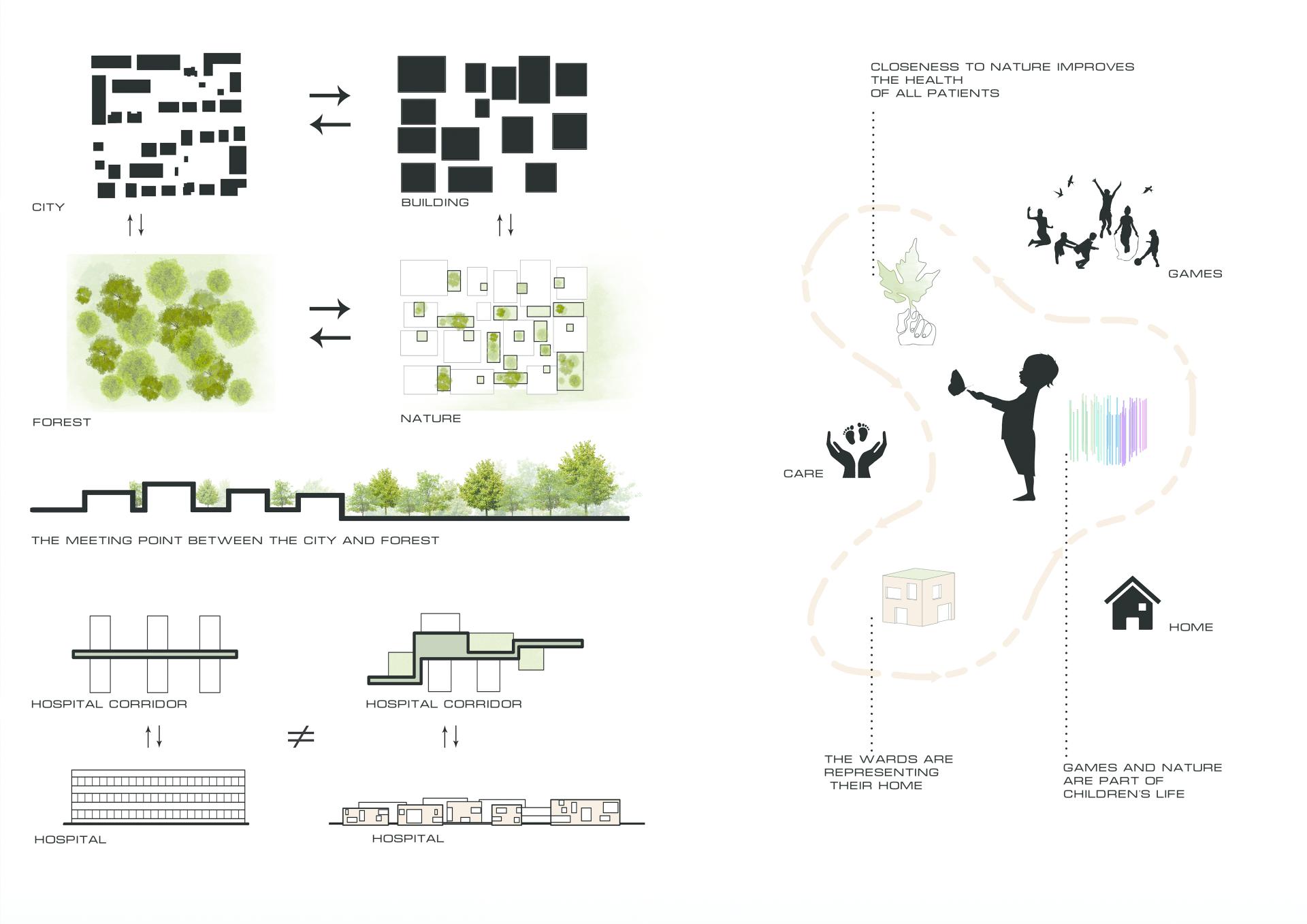 The main goal of the project is the complete escape from the feeling of a hospital as we know it, paying attention to how this can affect the physical and mental condition of children and their health.Closeness to nature is strongly associated with the healing process of children!Located on the border between the forest and the city, the building itself recreates the place where these two meet and enter each other. It is a diffuse environment composed of volumes penetrating the forest and many green areas scattering between them.The corridors in it are not long and dark, but well lit, taking our gaze to green courtyards, passing through common areas for waiting and playing. The large scale that the building suggests is broken down into smaller volumes with displaced windows that create a small children's town. The pavilion structure of the wards creates a sense of home for children, and the colored columns serve as a guide and are part of children's play.Through these means of expression is presented a children's world, very easily accepted by the child's psyche.