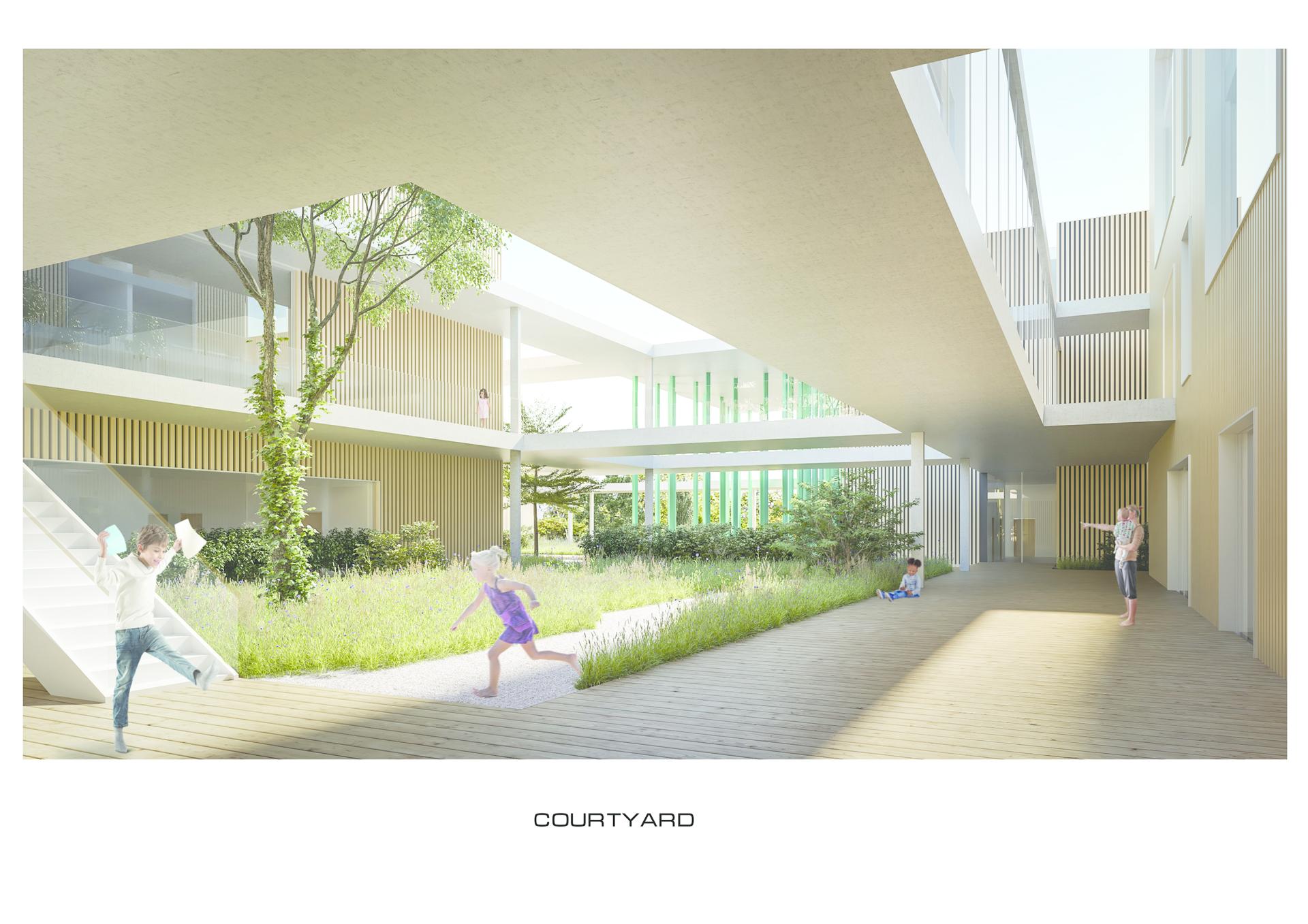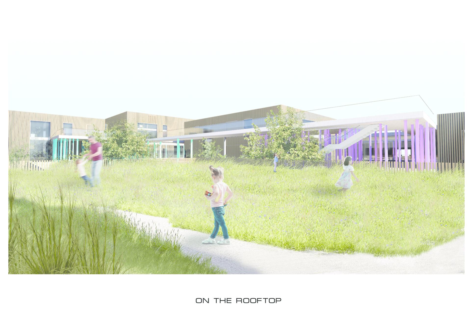 The closeness to nature is one of the most important features implemented in the healing process of the patients.The forest and the building are dwelling this place together. On the green roofs and yard children can play and relax, learning to value the nature. The choice of wood as a main material comes as the most natural solution which strongly emphasizes the idea of the building.The upper roofs are used for solar panels, through which the building can generate most of the energy used.