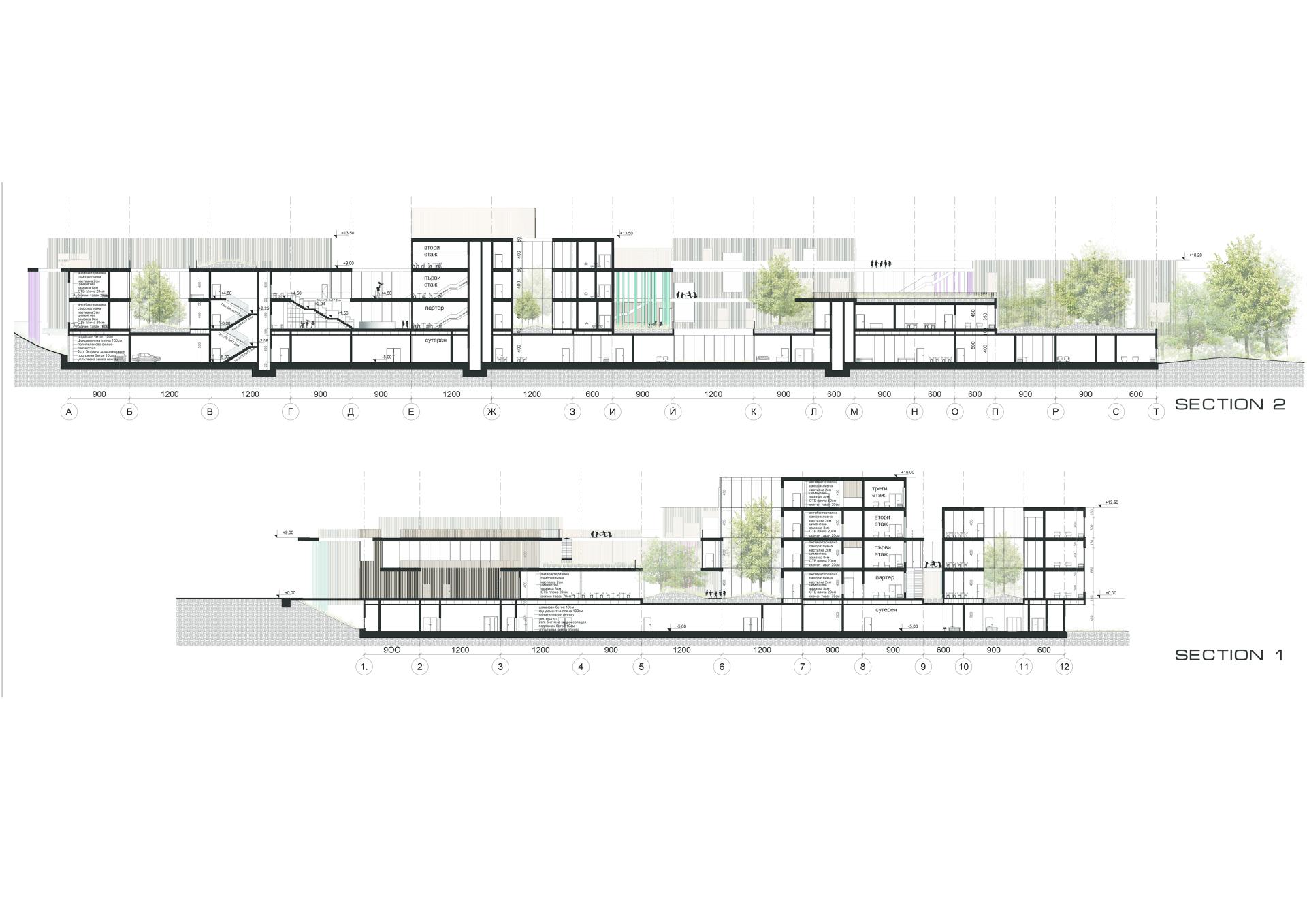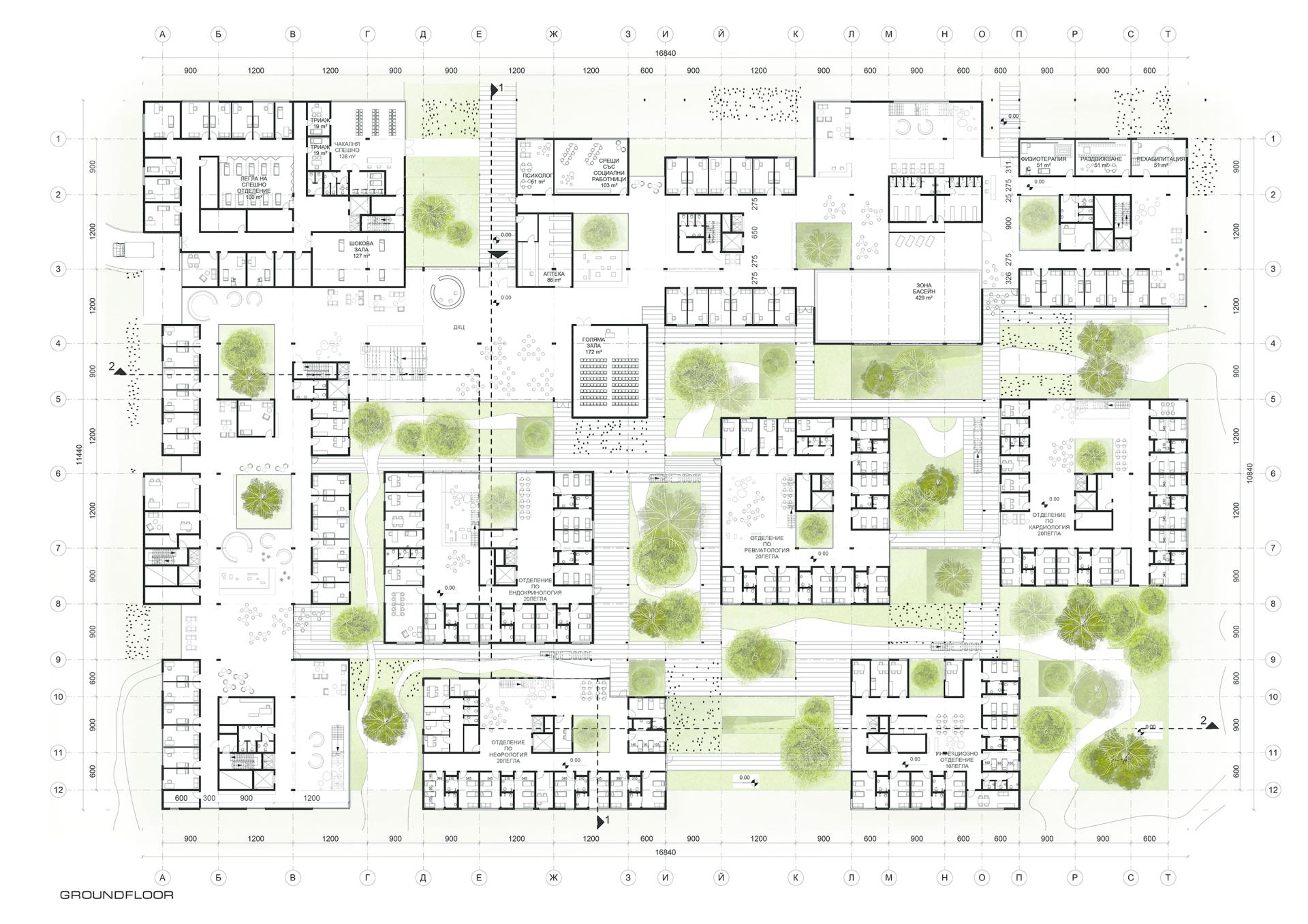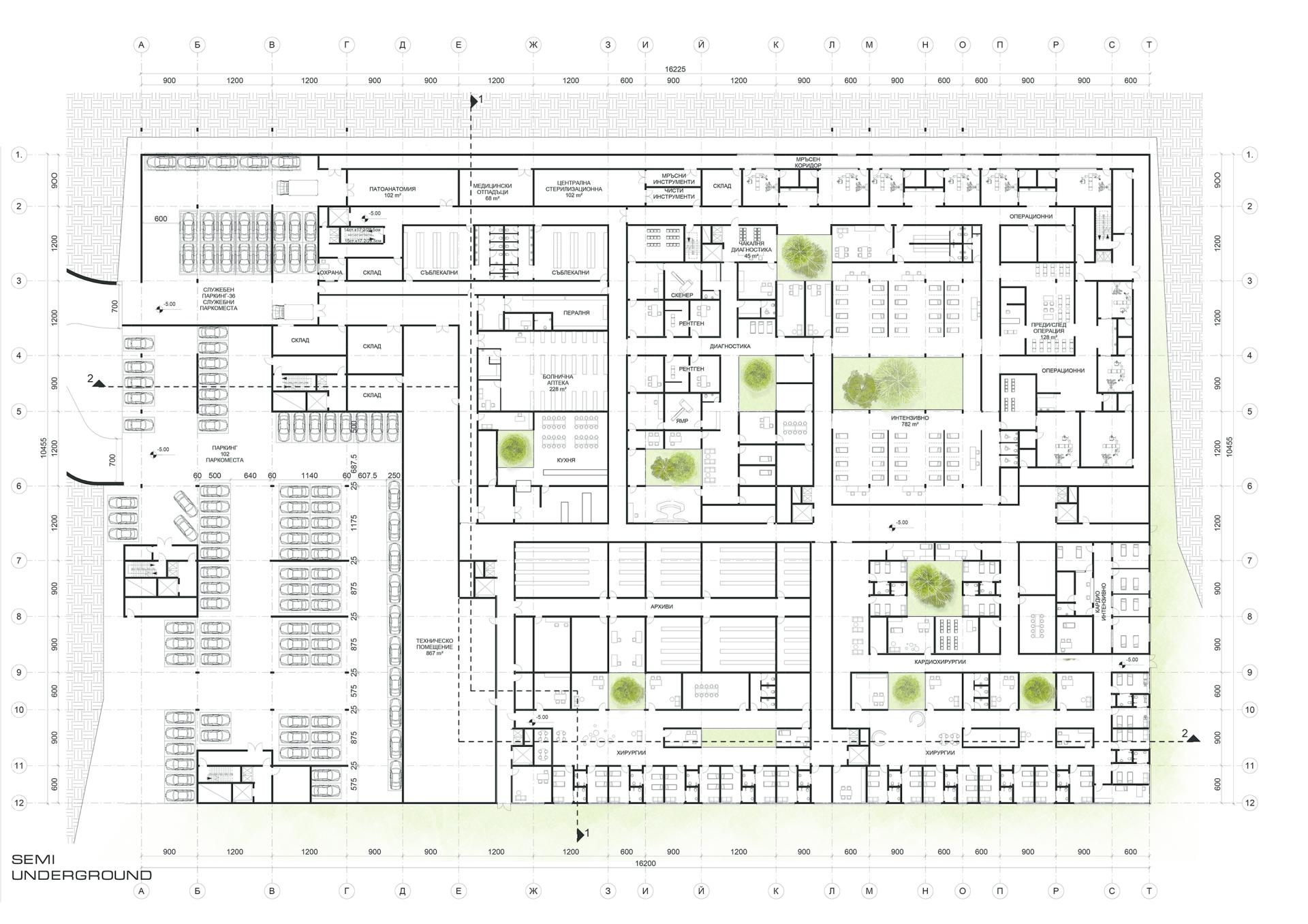 United in one common body (the outpatient clinic, emergency, laboratory etc.) build the northwestern front of the building, which surrounds the wards and creates a protective buffer between them and the city. The most convenient option is to unify the outpatient clinic units for quick and easy reorganization as medicine is constantly evolving and the requirements for organization around them are also changing. These areas, intended for outpatients, naturally form a division between themselves and the wards , which are organized in pavilions between the incoming forest from the southeast. The compartments can work completely independent of each other, being connected, vertically to the semi-underground floor, for their service. For this reason, horizontally, they have only one corridor connection at the first level, which provides the minimum necessary communication between the staff of the different wards and the connection of all wards with the training area. All areas are provided with natural lighting for higher hygiene and comfort.