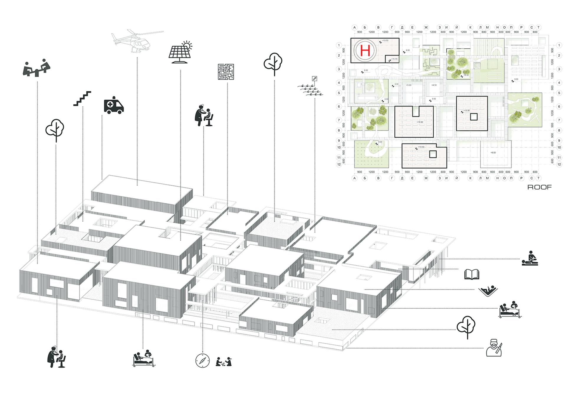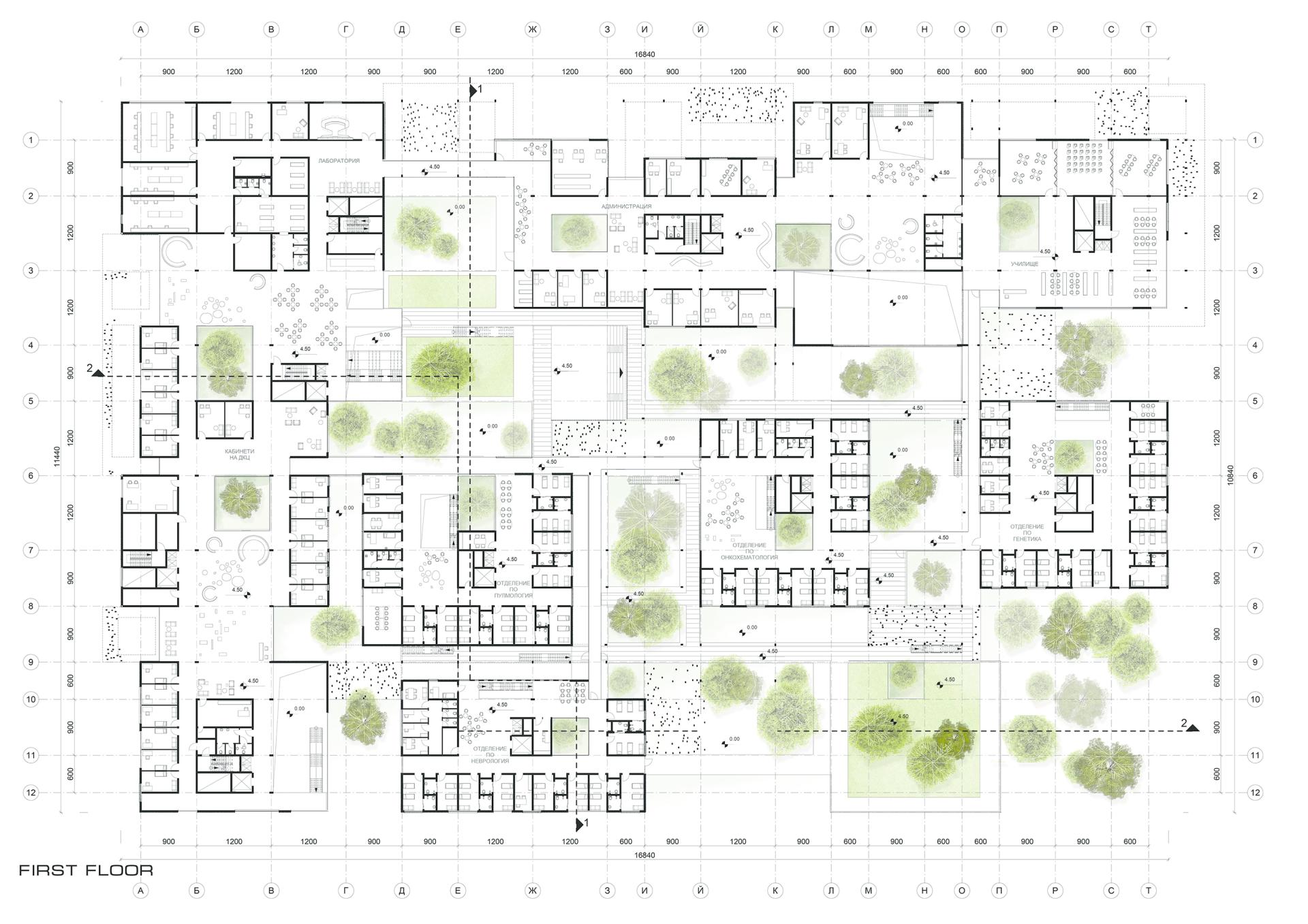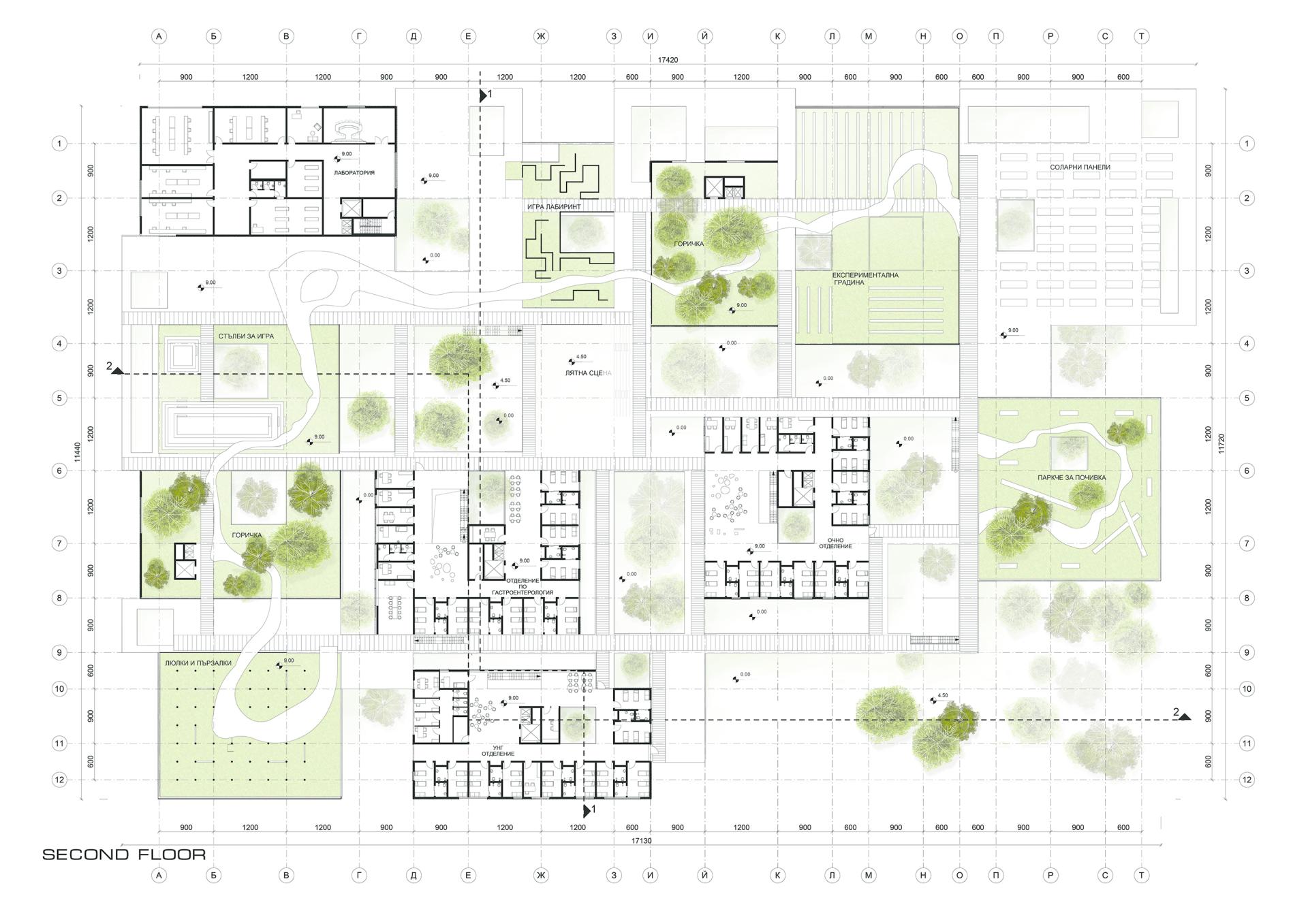 United in one common body (the outpatient clinic, emergency, laboratory etc.) build the northwestern front of the building, which surrounds the wards and creates a protective buffer between them and the city. The most convenient option is to unify the outpatient clinic units for quick and easy reorganization as medicine is constantly evolving and the requirements for organization around them are also changing. These areas, intended for outpatients, naturally form a division between themselves and the wards , which are organized in pavilions between the incoming forest from the southeast. The compartments can work completely independent of each other, being connected, vertically to the semi-underground floor, for their service. For this reason, horizontally, they have only one corridor connection at the first level, which provides the minimum necessary communication between the staff of the different wards and the connection of all wards with the training area. All areas are provided with natural lighting for higher hygiene and comfort.