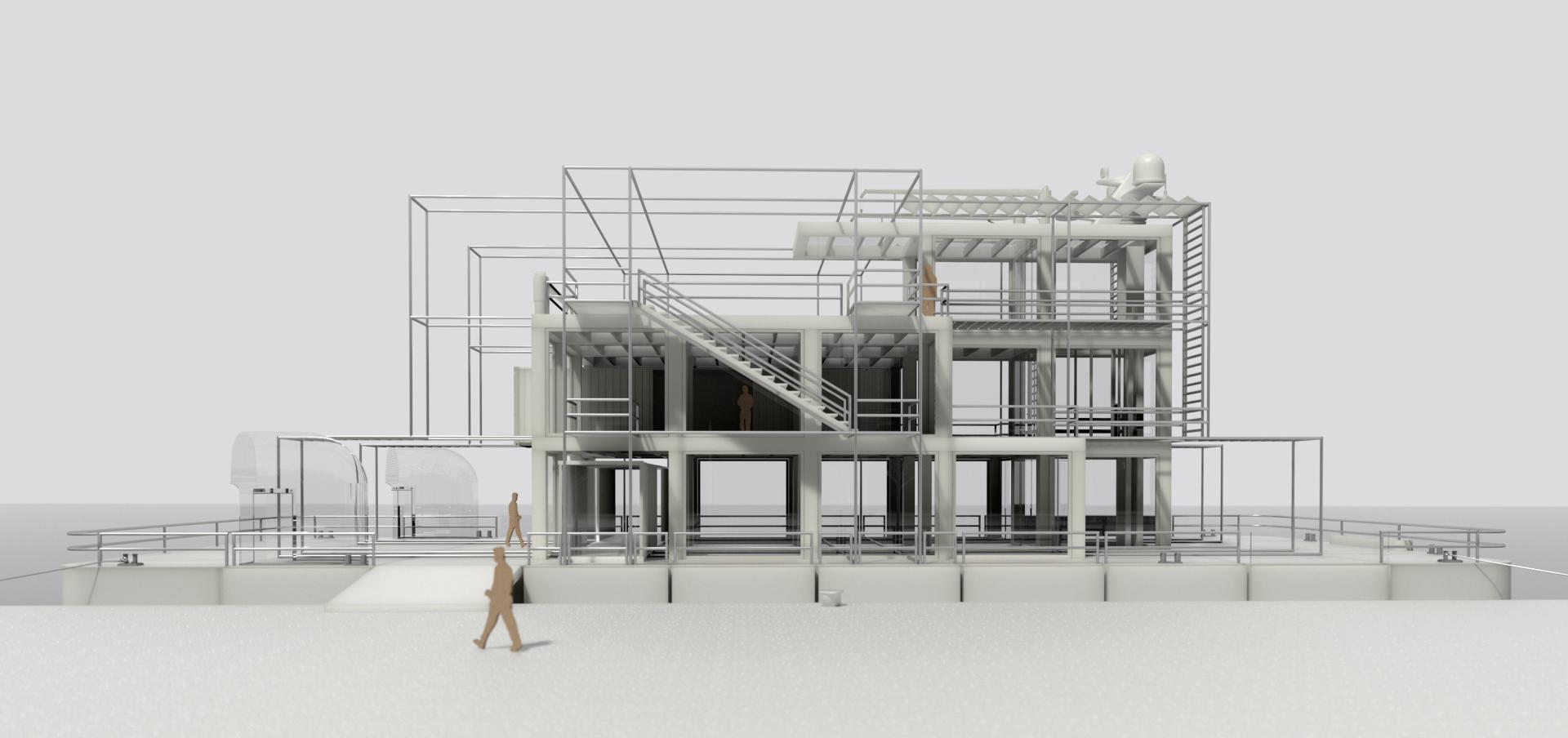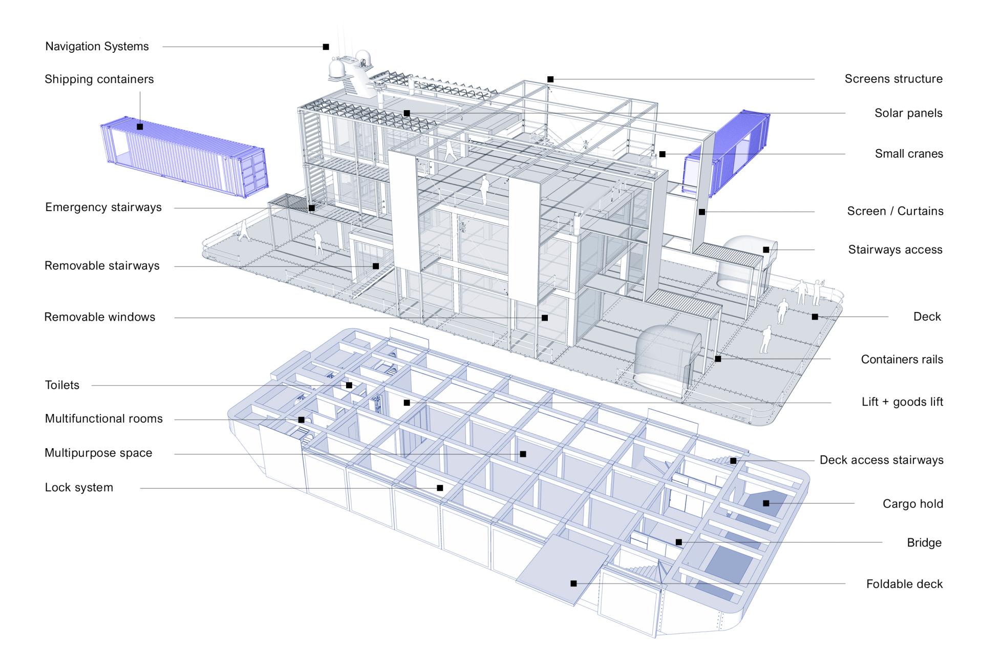 Thoroughly reviewed by naval engineers, BoAT has three interconnected basic parts: the barge - below deck there are the lock systems, the bridge, a cargo hold, a multi-purpose hall, cabins, and toilets -, the main building – a porous simple structure over-deck made of columns and beams and with four small cranes -, and a scaffold structure – a removable covering that holds railways, solar panels, and emergency stairways. This aquatic architecture becomes a living organism in symbiosis with its content and its surroundings, being adapted to each event and easily transformed into multiple shapes by means of modular extra components like removable windows, screens, and curtains of different size, and shipping containers turned into exhibition spaces, laboratories, workshops, or lecture rooms.