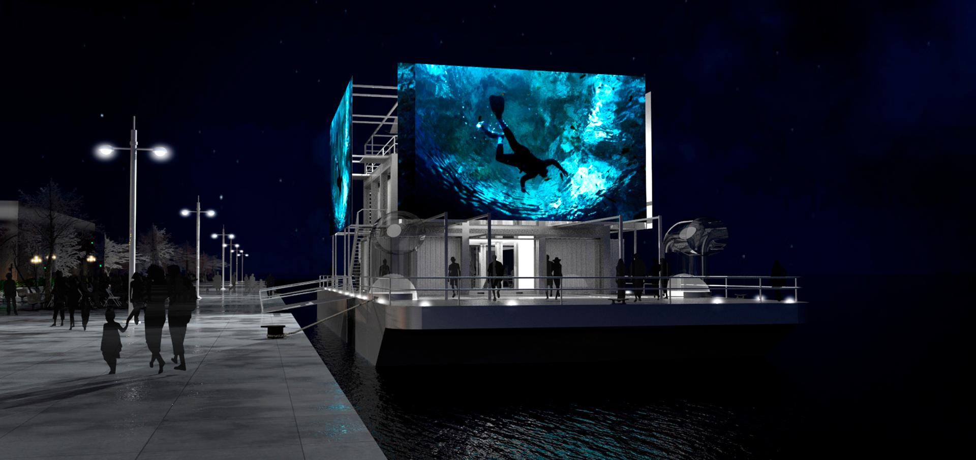 This floating architecture links nature with culture and stimulates environmental commitment, active communication, and aesthetic expression through art, technology, science, and expanded education. A three-dimensional interface to exhibit, research, and innovate and a moving lighthouse of digital experience that projects audiovisual contents. A European living laboratory of interdisciplinary and intersectional knowledge that contributes to creating a network of users. A barge in motion that facilitates the execution of Routes to cover different cities and promote the encounter and the interrelationships.