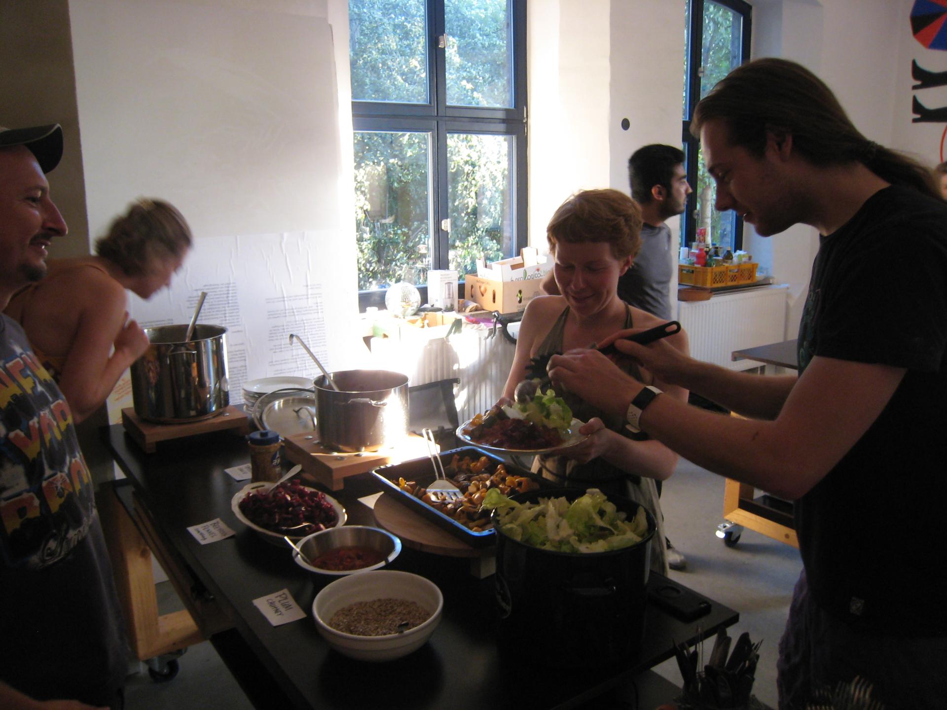 As a result of our pragmatic approach the students feel empowered, begin to get involved and shape the world around them. They took over a vacant room on the campus, named it [cloud] and turned it into a meeting room in which they can work, converse or just relax. In the town of Dessau they took over a derelict building and began to plant vegetables in the garden, fixing rooms and created shared workshops and co-working spaces. This turned into a lively, thriving community. The newly restored kitchen is used for a food sharing project for foods donated from a local grocers.