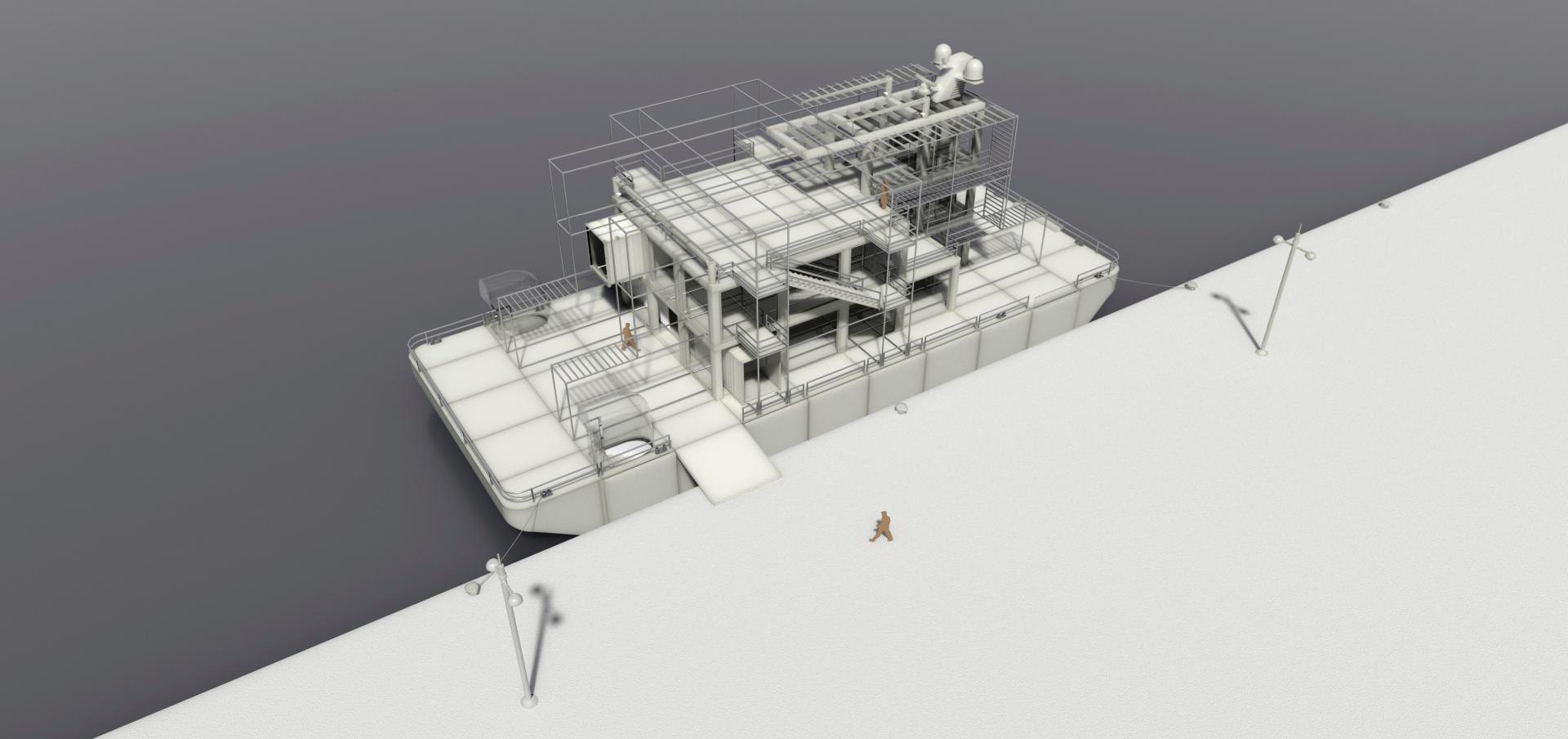 Thoroughly reviewed by naval engineers, BoAT has three interconnected basic parts: the barge - below deck there are the lock systems, the bridge, a cargo hold, a multi-purpose hall, cabins, and toilets -, the main building – a porous simple structure over-deck made of columns and beams and with four small cranes -, and a scaffold structure – a removable covering that holds railways, solar panels, and emergency stairways. This aquatic architecture becomes a living organism in symbiosis with its content and its surroundings, being adapted to each event and easily transformed into multiple shapes by means of modular extra components like removable windows, screens, and curtains of different size, and shipping containers turned into exhibition spaces, laboratories, workshops, or lecture rooms.