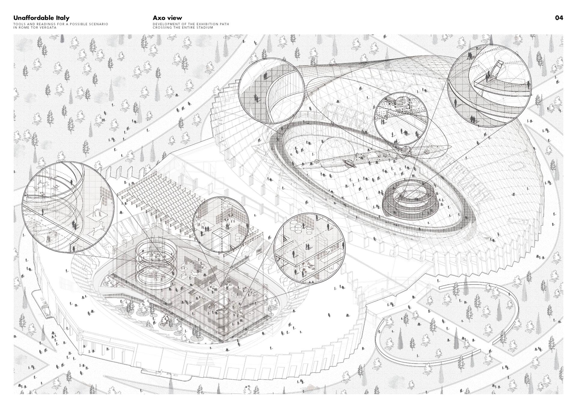 The large Stadium by Calatrava represents the symbol of unfinished architecture in Italy, located in the middle of the Roman countryside. The challenge of this project is reinventing the strong landmark already existing in the rural landscape, and transforming it in a new scientific pole made it from and for the community. The unfinished stadium is reactivated mainly as a museum dedicated to the sciences, then by hosting in part some research spaces.