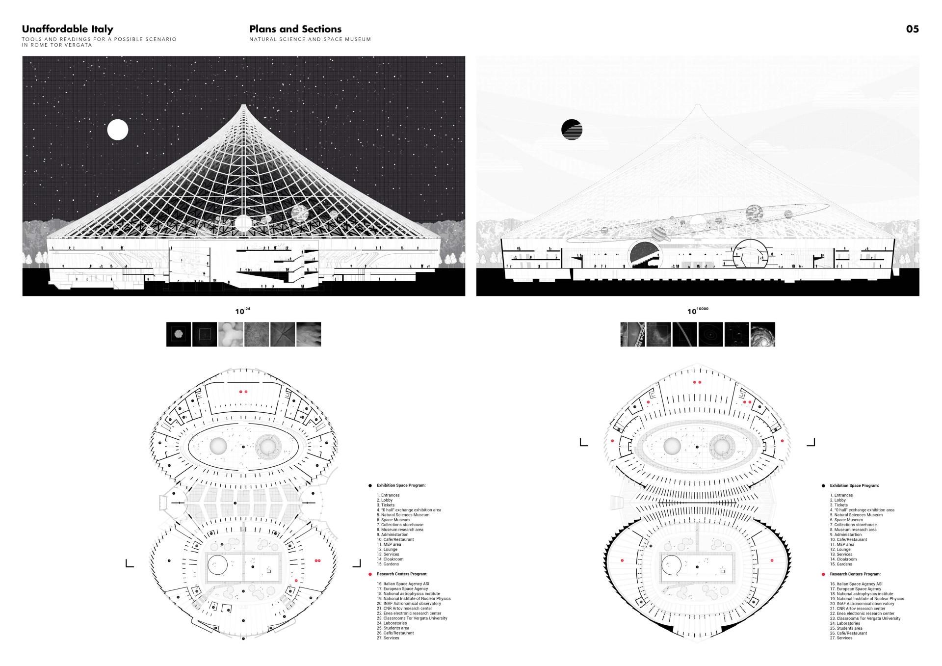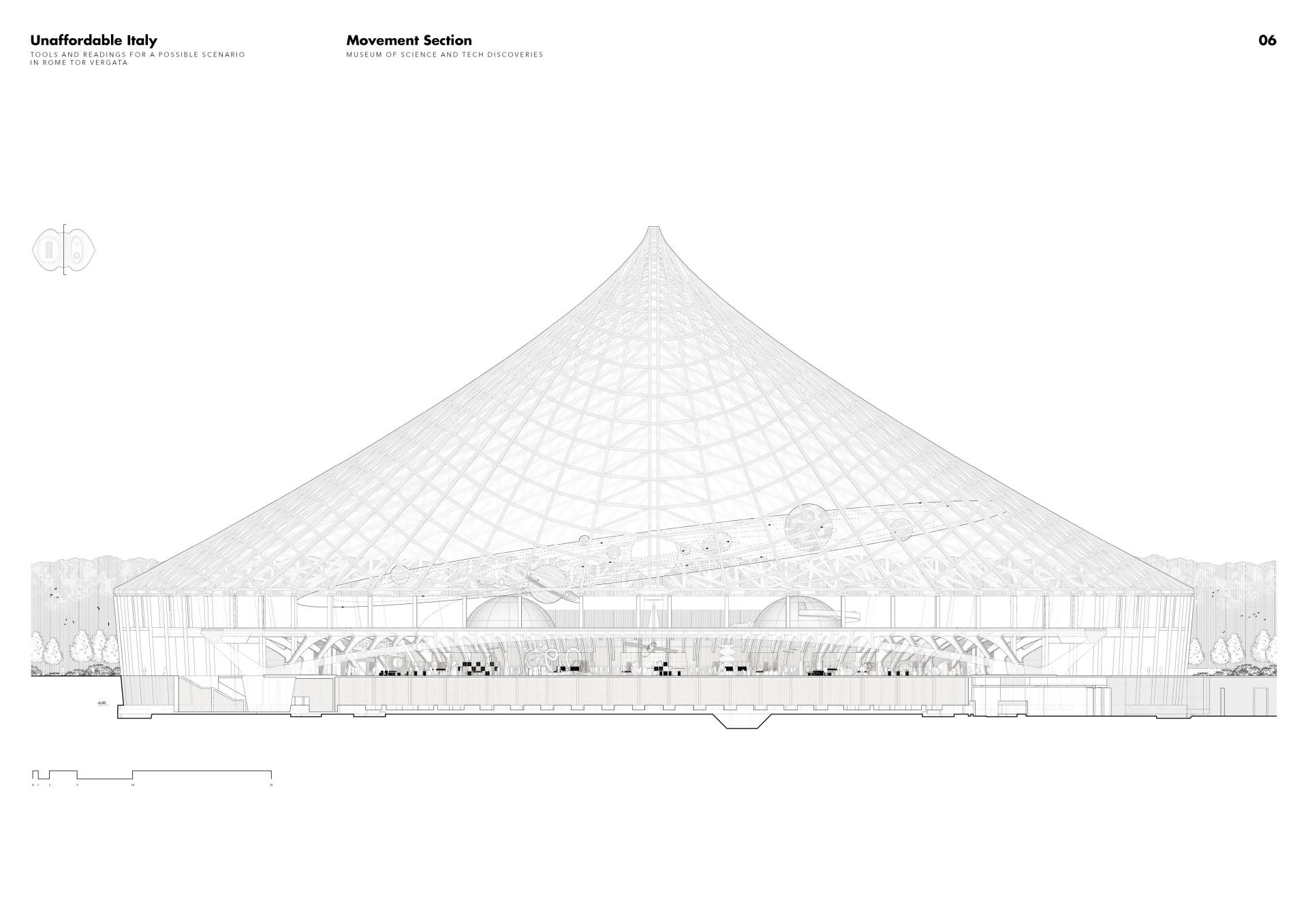 The unfinished stadium can become an opportunity for rethinking the urban scale of Tor Vergata. The reuse of the architectural object is configured as a science district where the countryside becomes domestic, participatory. From the rural landscape, the user is informed that something is taking place: a space in making, evolved, contaminated and still transcribed, dichotomous, superimposed and intercepted. The museum is combined with research spaces, thanks to an integrated AI (Artificial Intelligence) system of continuous exhibited space and no standard exhibits, the visitor/content relationship is now madded, so the meaning of museum drastically approaches the contemporary world of the visitor. In the project, in fact, the user can manage the contents which "informs" the space and takes an active part in the creation of exhibitions - productions - meetings. An open source museum, not just a physical building, but an aspiration to freedom in all fields of knowledge.