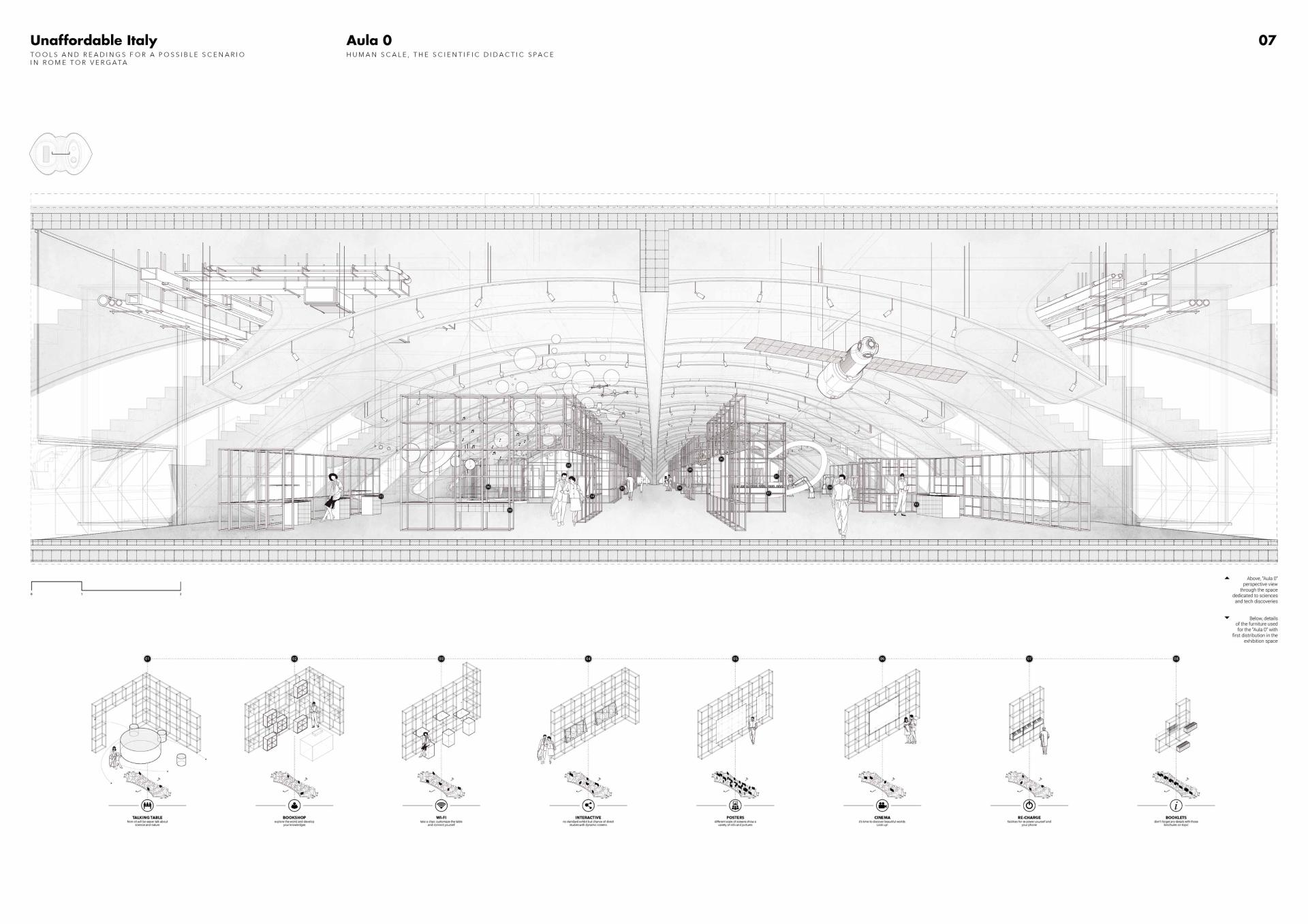 The unfinished stadium is re-functionalized mainly as a museum dedicated to the sciences, then by hosting in part some research spaces. What is proposed is a dynamic space where the user is not just a spectator within the path, but becomes an actor interacting with the space all around through interactive furnitures, modular display grids that will allow autonomy in the creation and also management of complex spaces, adaptable and also contents to study deep.