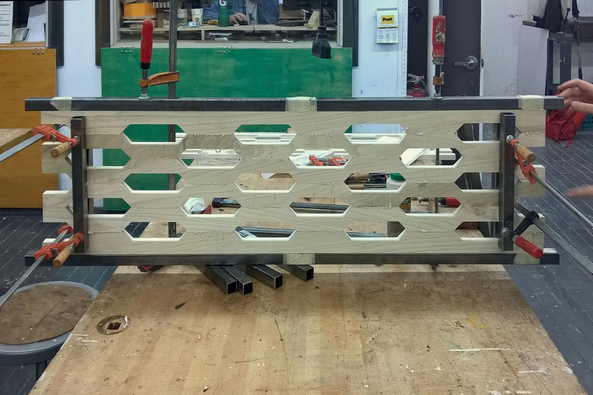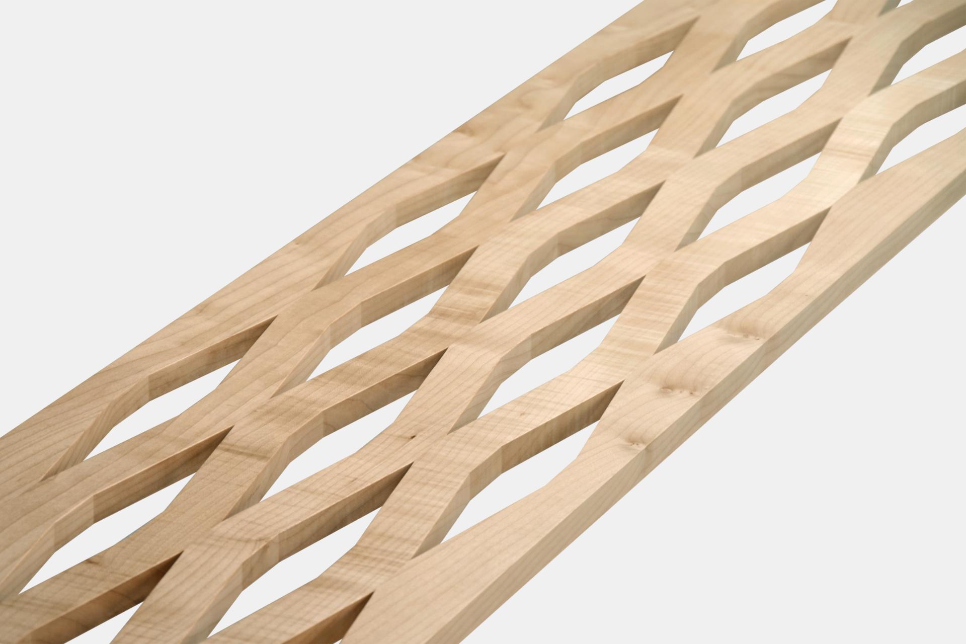 It is made by cutting wood into curvilinear slats, turning every other element and laminating it, forming a hexagonal mesh with oblong gaps in-between elements. The gaps between slats help to reduce the amount of raw wood used for production of the material by more than a quarter.
