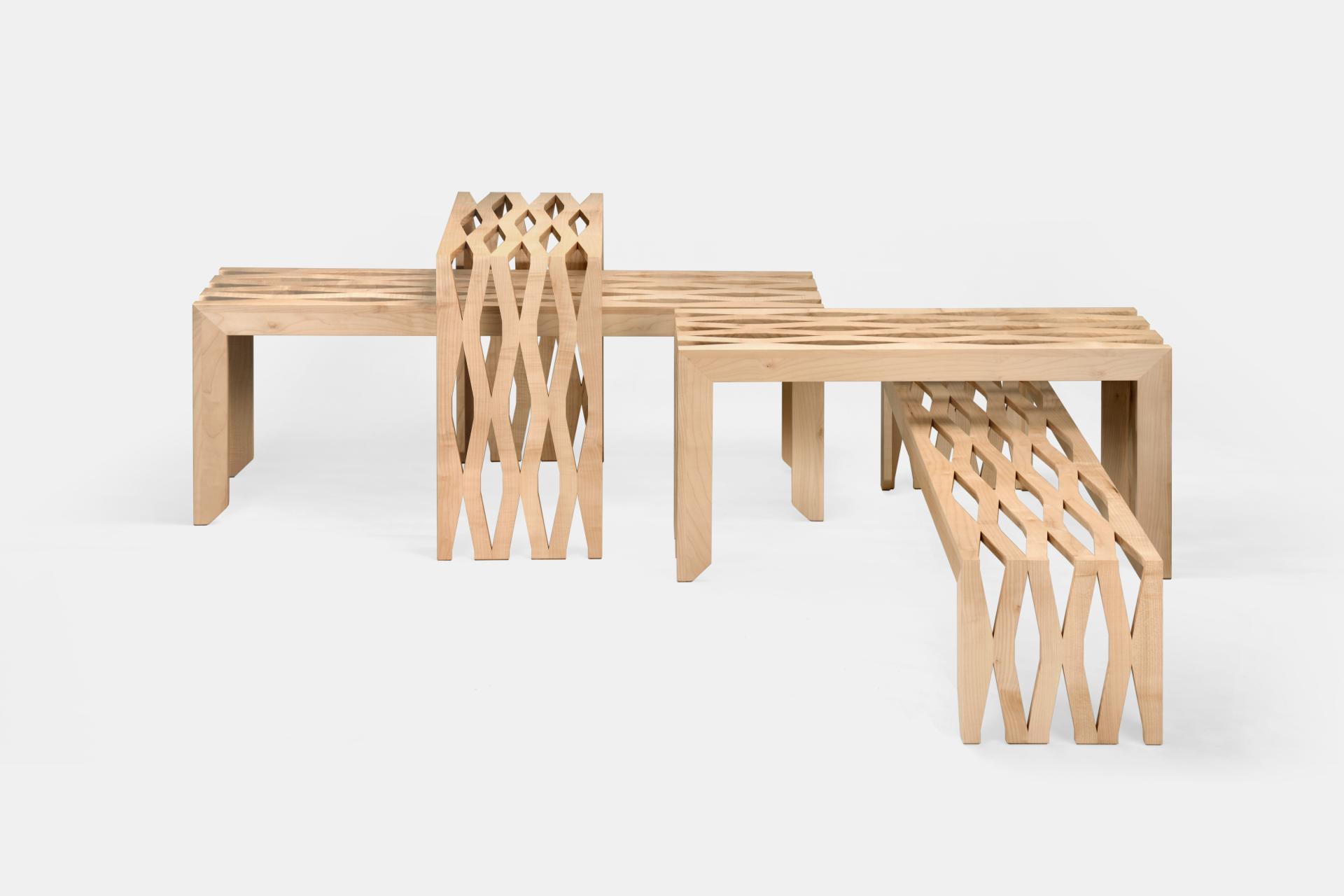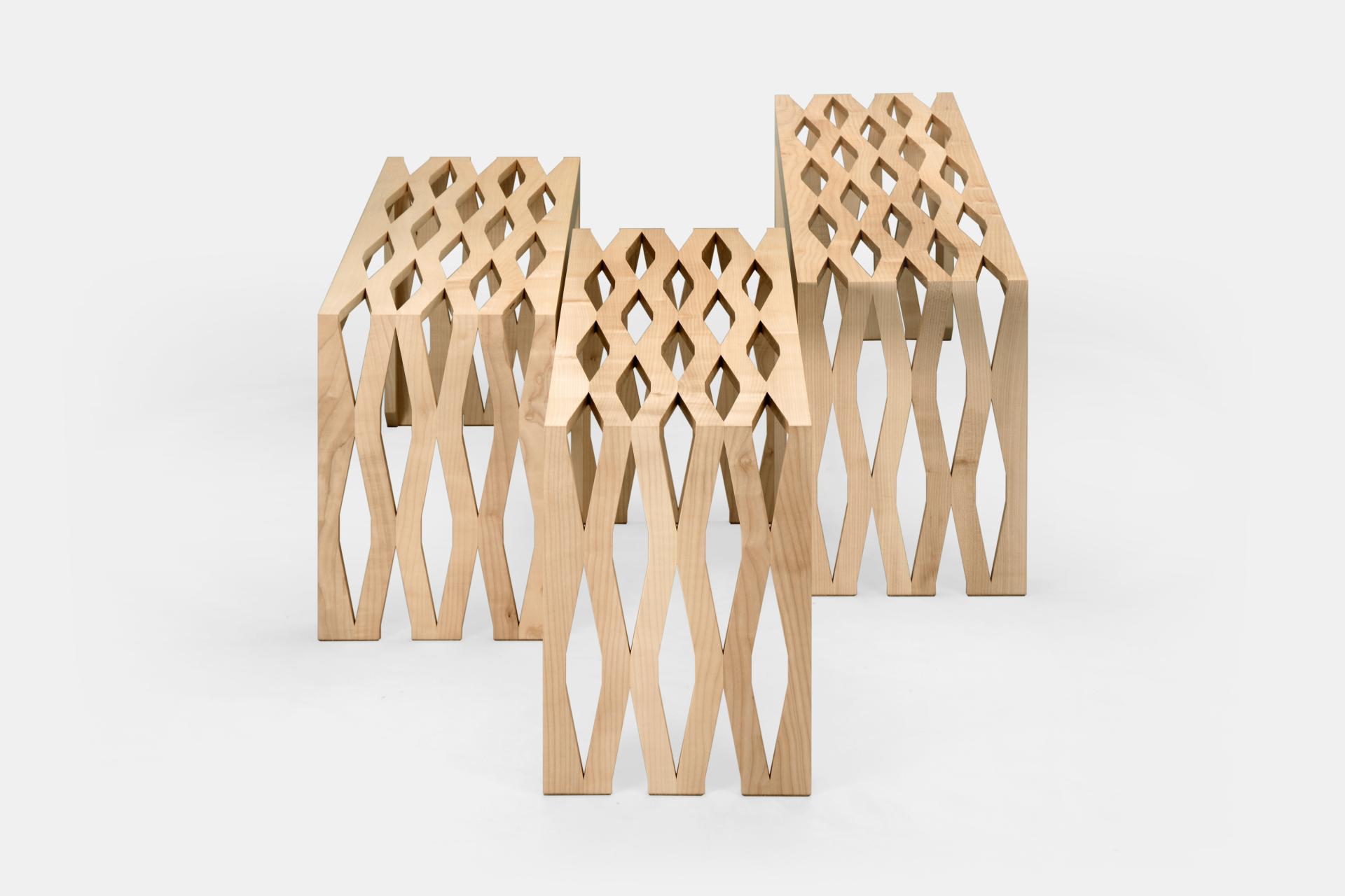 The material, with its openwork structure, is satisfactory both to use and to look at. Due to its rhythmical complexity it seems to look a bit differently every time we look at it. Depending on an angle, light or background the structure appears very openwork or nearly solid. Sometimes the grid seems oblong and sometimes it looks almost square. The thickness of the panel seems to change too. The unique form of the mesh originates from two revolutionary inventions: expanded sheet metal, invented in 1883 by John F. Golding and honeycomb panels created in 1890 by Julius Steigel. The grids developed by these two inventors were confronted with traditional Slavic and Scandinavian crafts and patterns, which inspired the final shape of Expanded Wood.