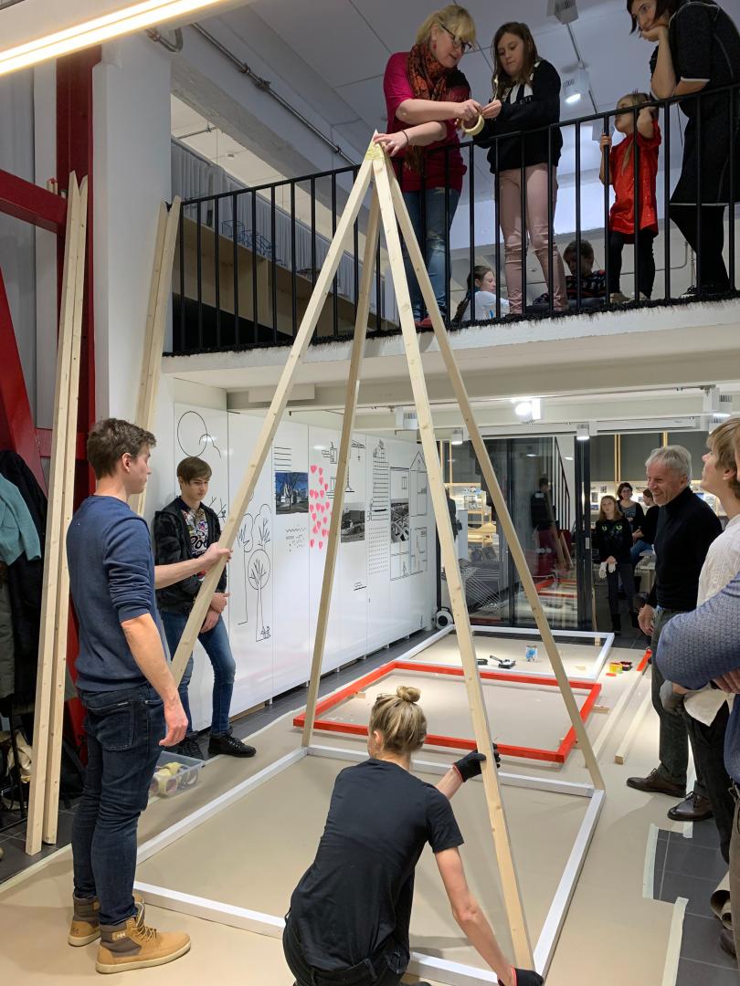 Inclusion of children and youth of various age groups is essential to Arhitektuurikool educational program, as it is open to all interested children and young people who want to develop their understanding of and skills in spatial design. Playful and exciting assignments as well as creation and discussion help the kids to see, understand and value their everyday spatial environment from different viewpoints: aesthetical, functional, social, etc. Arhitektuurikool’s teachers are experienced in discussing spatial topics with children and teens, as well as in developing new learning activities. To give an example of one lesson, during an hour and a half, under the guidance of architects, one topic is introduced, concepts and questions are discussed, built, crafted, drawn or sketched. Afterwards all examine together, how the completed work relates to the topic, what solutions it offers or what questions it raises. Younger children find questions, answers and new knowledge through manual activities, older students analyse new topics in depth and gain experience through discussions and practical tasks. Arhitektuurikool does not teach new architects, but rather focus on noticing, understanding, perceiving and creating everyday space. The courses include also visiting different buildings and exhibitions, where students learn to analyse what they see and consciously experience architecture. Every child has an important role in Arhitektuurikool, because their thoughts and spatial experiences are unique. They can always express themselves and discover how their companions see the world. Another key aspect is involvement of teachers in the process, thus the educational materials are prepared together with the teachers across highschools in Estonia. The feedback has been truly encouraging, as the course has exponentially grown popularity among the teachers who have pointed out how well the program expands and diversifies the students' understanding of the built environment.