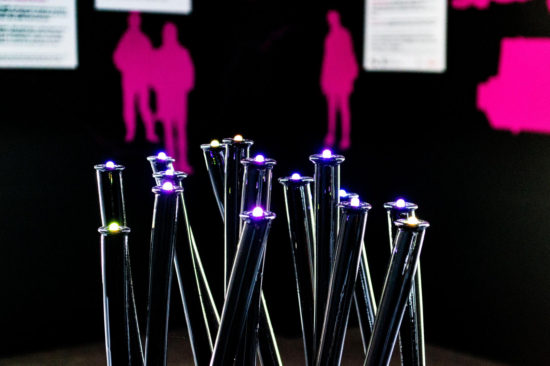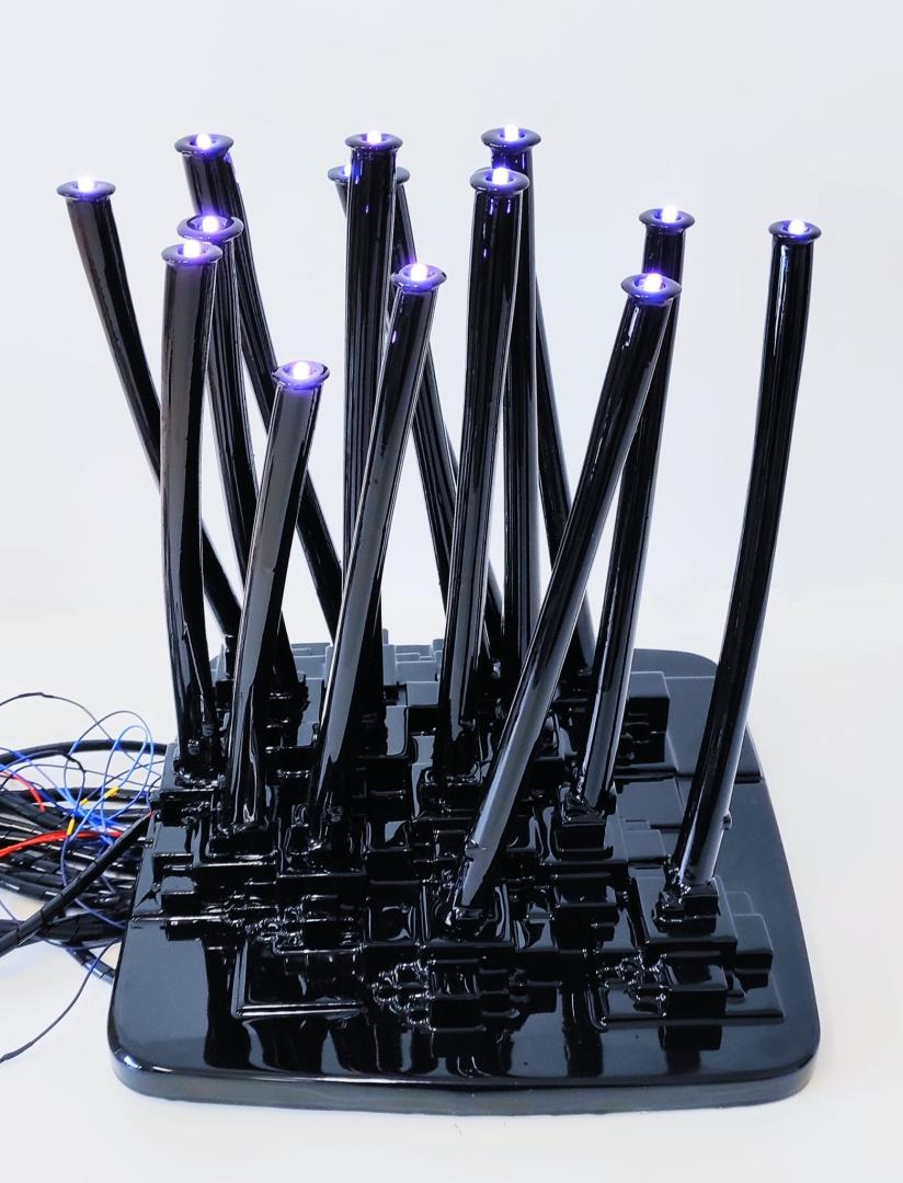 Formed by fifteen glowing cylinders, ending with a small pulsating light, its alien organic shape is inspired by the Dianthus Rupicula (a typical riparian plant of the region). As wild plants grow on rocks, its 3D printed body emerges from a black pixelated block of wood hiding the roots: if you open it, the tangle of cables and electronics from which the computational organism draws data and electricity (its nourishment), reveals itself.