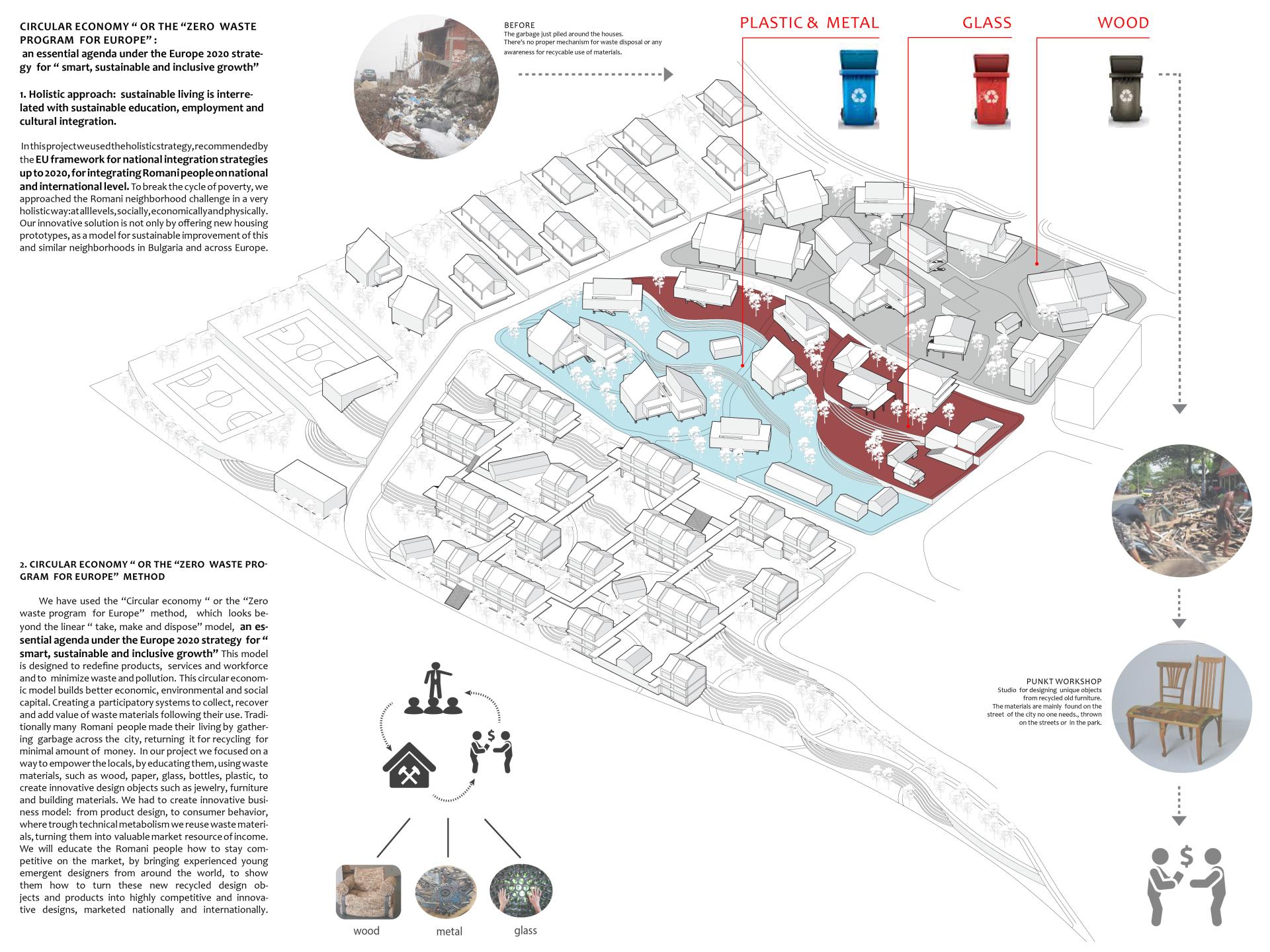 We used the traditional crafts of the Romani's people for their empowerment and integration. Traditionally many people made their living by gathering garbage across the city, returning it for recycling for a minimum amount of money. In our projects we focused on ways to empowers the locals, by educating them, using waste materials such as wood, paper, glass, bottles, plastics, to create innovative design objects such as jewelry, furniture, and building materials. We had to create the innovative business model: from product design to consumer behavior, where through technical metabolism we reuse waste materials, turning them into valuable market resource outcomes. We will educate Romani people on how to stay competitive on the market, by bringing experienced young emergent designers from around the world, showing them how to turn these new recycled designs and objects, and products into highly competitive and innovative designs, marketed nationally and internationally. To support this new economic model, our neighborhood was divided into 3 major districts, where glass, metal, and woodshop recycling workshops were located. Small businesses were created on the ground floor of the each living unit, giving the residents unprecedent opportunity for sustainable living development.