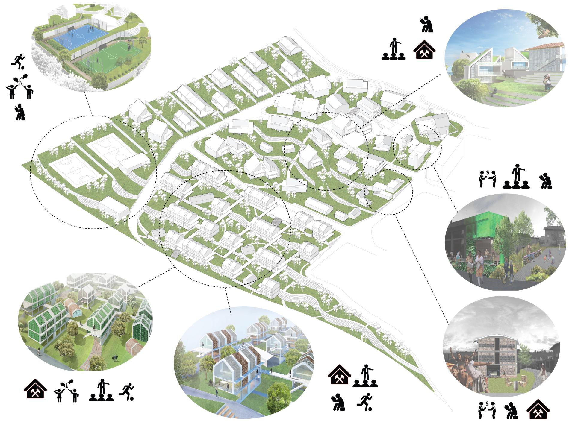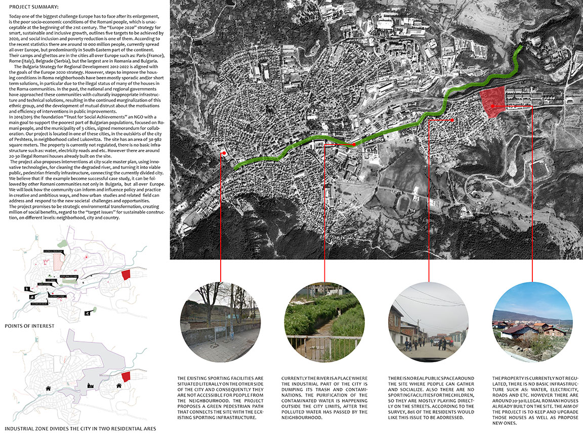 Our project in Lukowitza, located in the outskirts of the city of Peshtera, is targeting the poor socio-economic conditions of the predominantly Romani people in Bulgaria, lacking basic services and adequate housing. There is no basic infrastructure, such as water, electricity, roads and etc. However, there are around 20-30 illegal houses already built on the site. Our innovative solution was not only by offering new housing prototypes, as a model for sustainable improvement of these vulnerable neighborhoods in Bulgaria and across Europe but also by using a more holistic strategy, recommended by the EU framework for integrating Romani people on a national and international level. Approach, where the physical improvement of the neighborhood, such as housing, is combined with the social and economic integration (employment, education, and healthcare). The project also proposes intervention at the city-scale master-plan, connecting the physically isolated neighborhood to the rest of the city, using innovative technologies, for cleaning the degraded river, and turning it into viable public, pedestrian-friendly infrastructure.