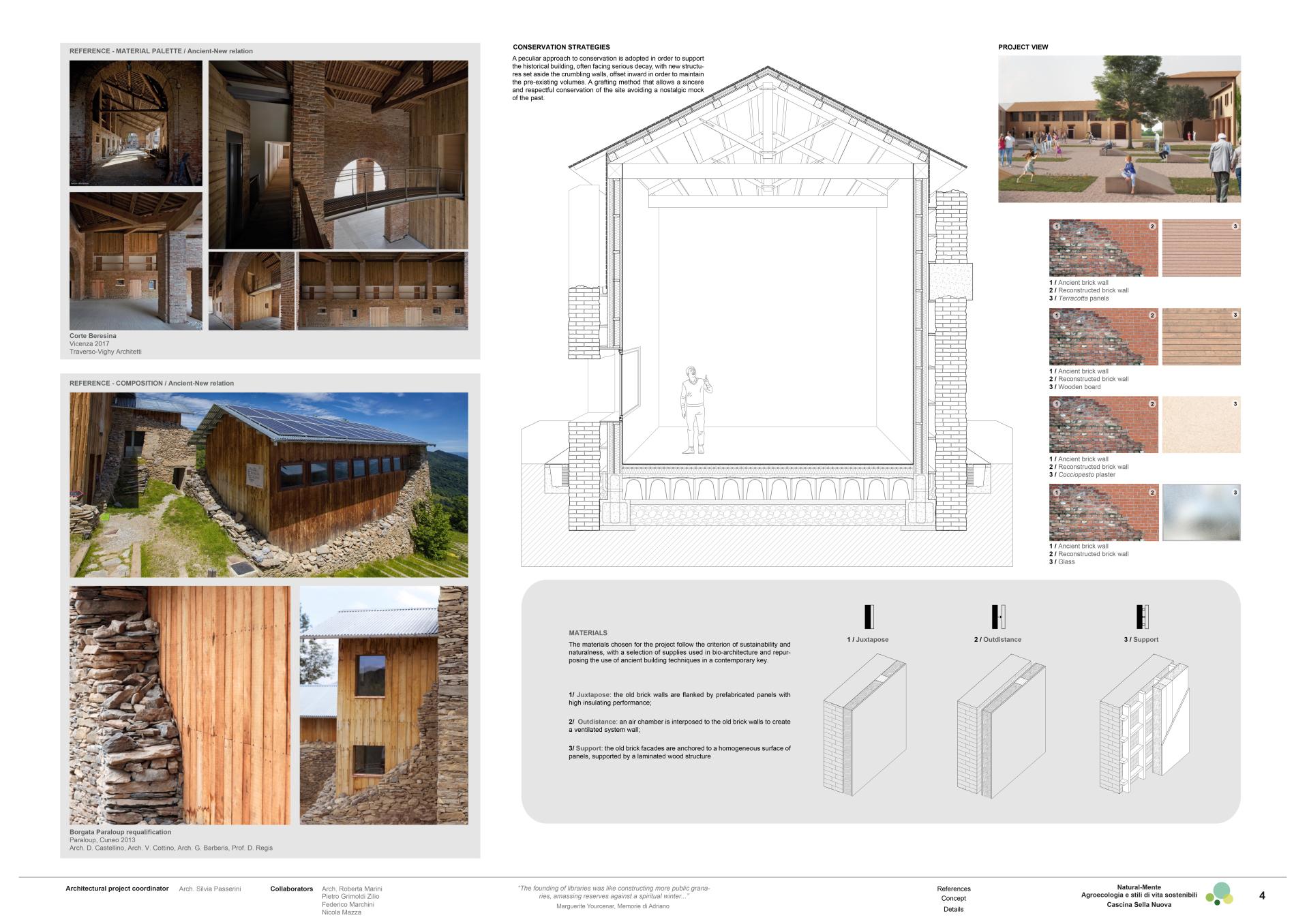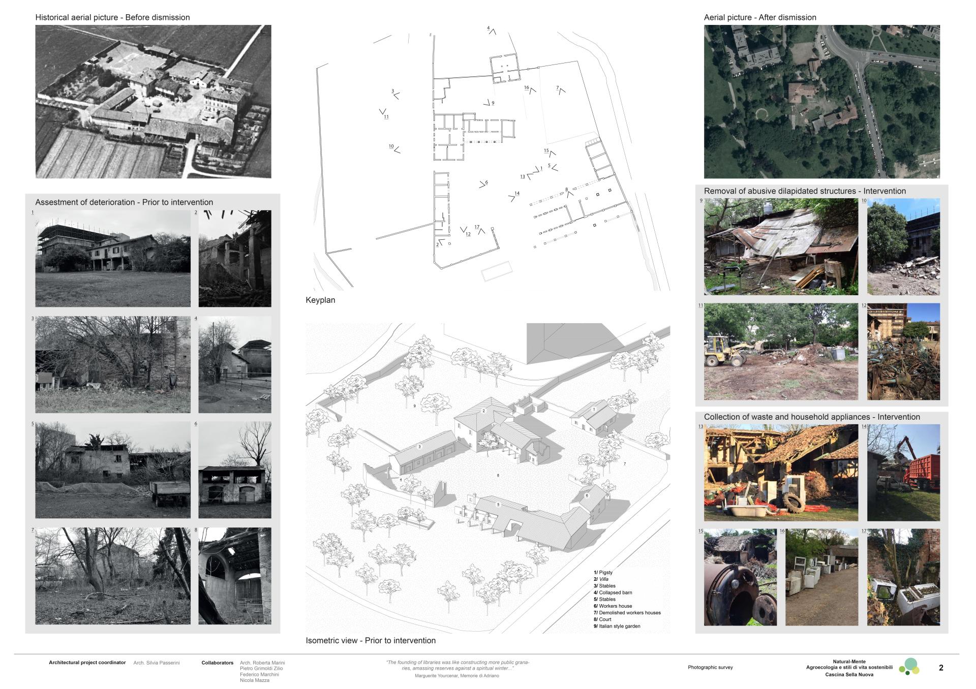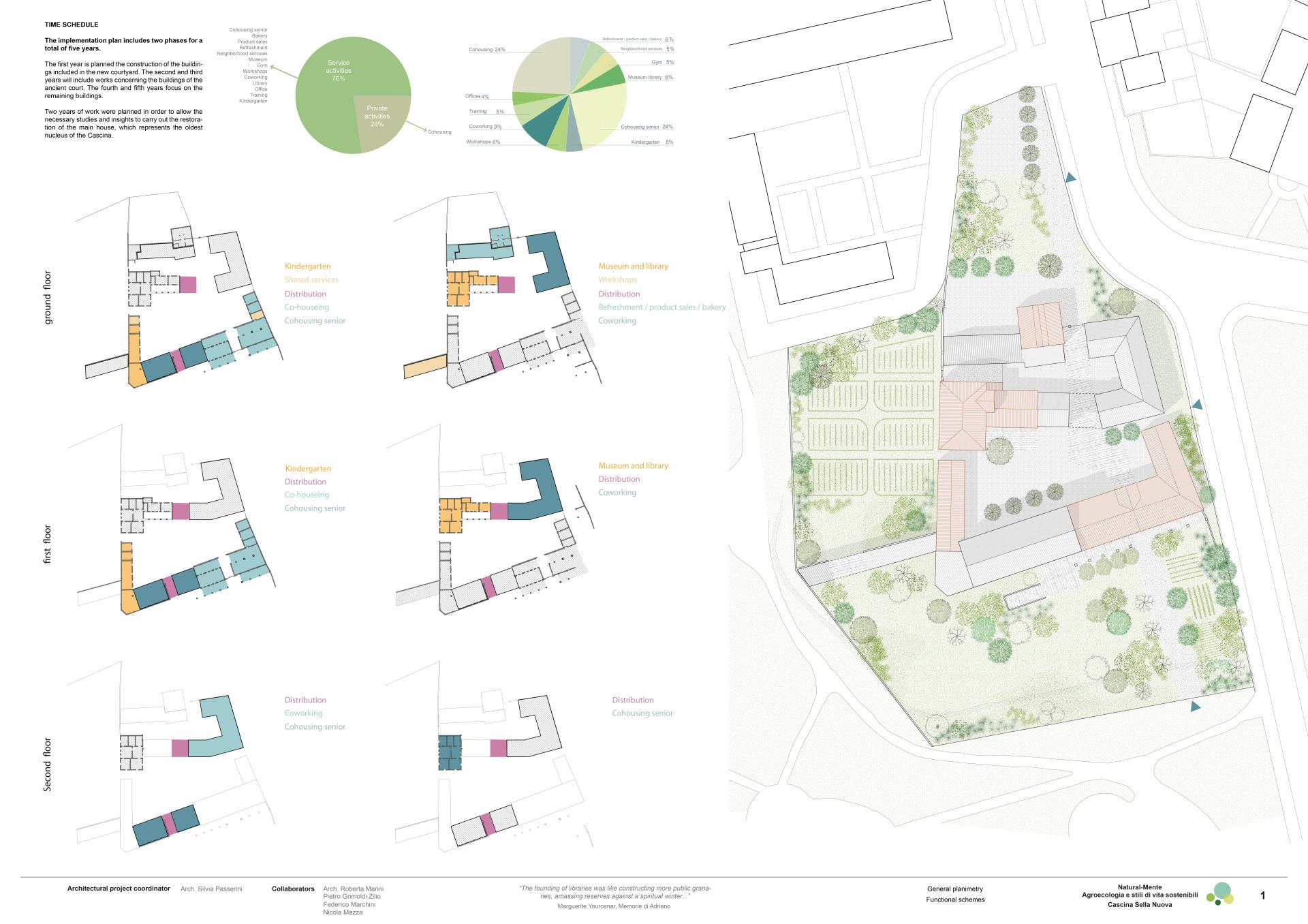 Concerning buildings, an in-depth historical research has allowed architects to study the ancient "Cascina Lombarda" which included living, working and socializing/ creating culture, all closely connected with the relationship that humans had with nature and with the resources of the environment. A path of meetings and dialogue with the subjects involved in the project brought to a plan which returns new agricultural, commercial, educational, tourist and cultural functions in full synergy with restoration and recovery of pre-existing and protected buildings.