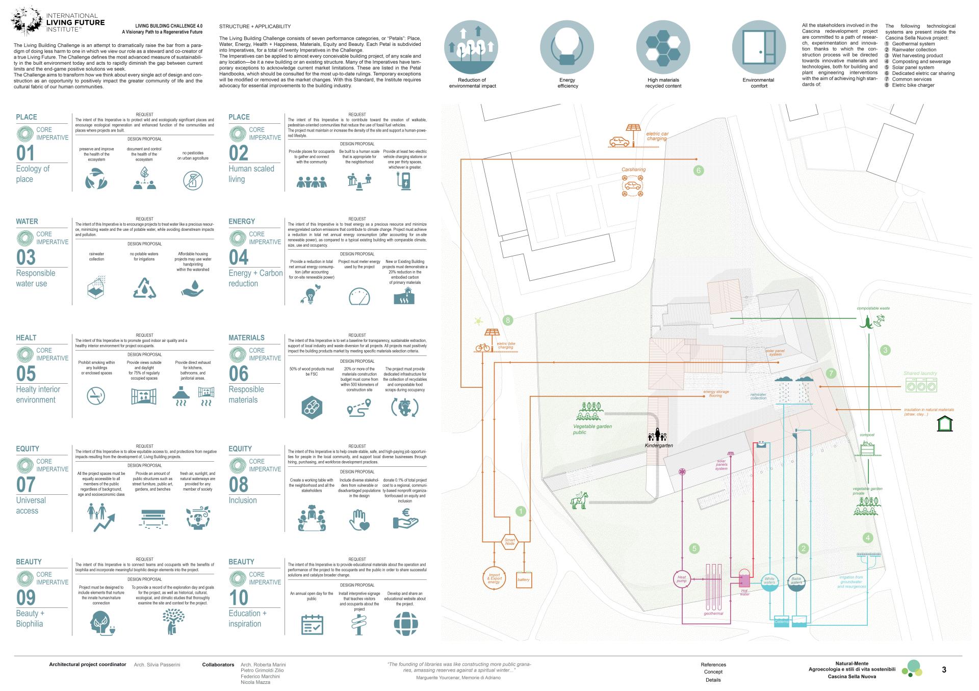 CSN goes beyond "Green" and pursues the ambitious "Living Building Challenge" Core certification. The project will respect a series of parameters to maximize the impact of your choice and it results to be highly innovative. In particular, concerning the Ecology of Place, no petrochemical fertilizers or pesticides are being used for the operation and maintenance of the on-site landscape, including urban agriculture. CNS is designed to be a human scale project, therefore, pedestrian paths and weather protection on street frontage will be considered, the uptake of human-powered and public / shared transportation will be facilitated, a transit subsidy for all occupants of the project will be provided; responsible water use will be pushed.