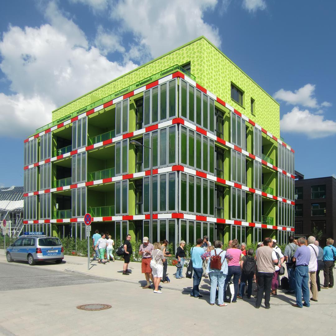 The BIQ is a 4-story residential building realized for the International Building Exhibition in Hamburg in 2013 (IBA Hamburg) following an international design competition. The BIQ - with a Bio-Intelligent Quotient - is the world’s first building with a Bioenergy Façade, integrating living micro-organisms in the holistic design of the heating system. The solar thermal effect provides heat for the 15 units with a total of 840 m² usable floor area. The BIQ - to date in full operation - demonstrates ground-breaking applied research in the field of living building systems and inspires the research and bio-design community around Europe and beyond.