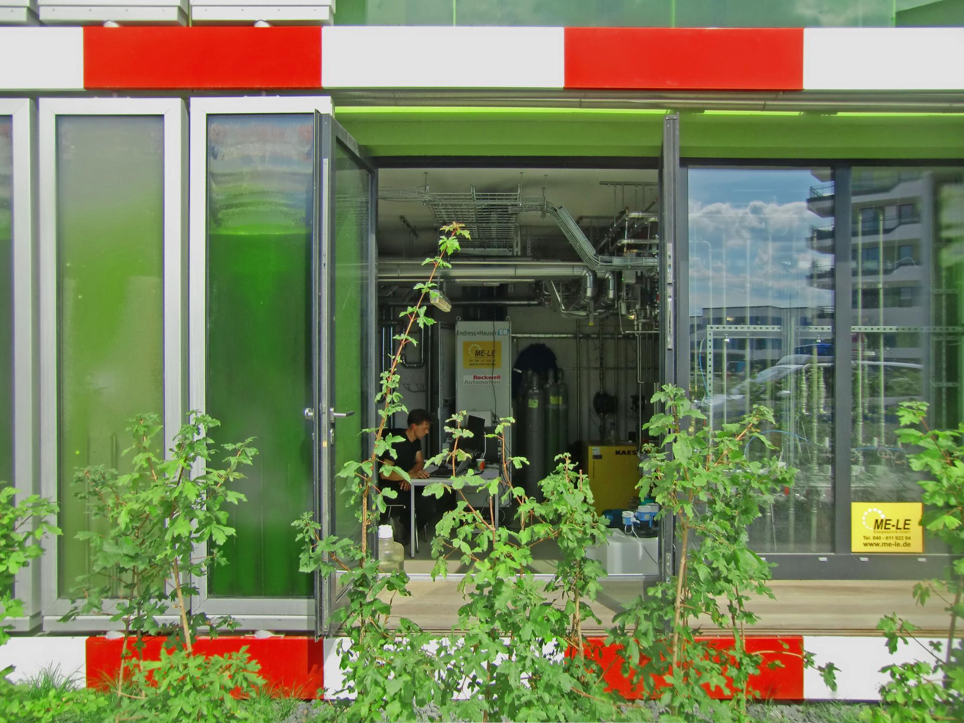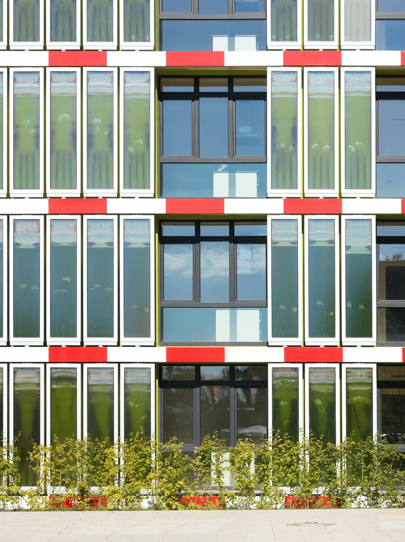 The south-east and south-west facing Bioenergy Facades of the building are equipped with 129 flat panel photobioreactors for cultivating a local strain of green microalgae. The panels provide an ideal habitat for the organisms to absorb daylight and transforming carbon into biomass. In addition, the part of the daylight spectrum not absorbed by photosynthesis is converted to heat through the solar thermal effect. Heat and biomass generated by the facades are harvested on site.