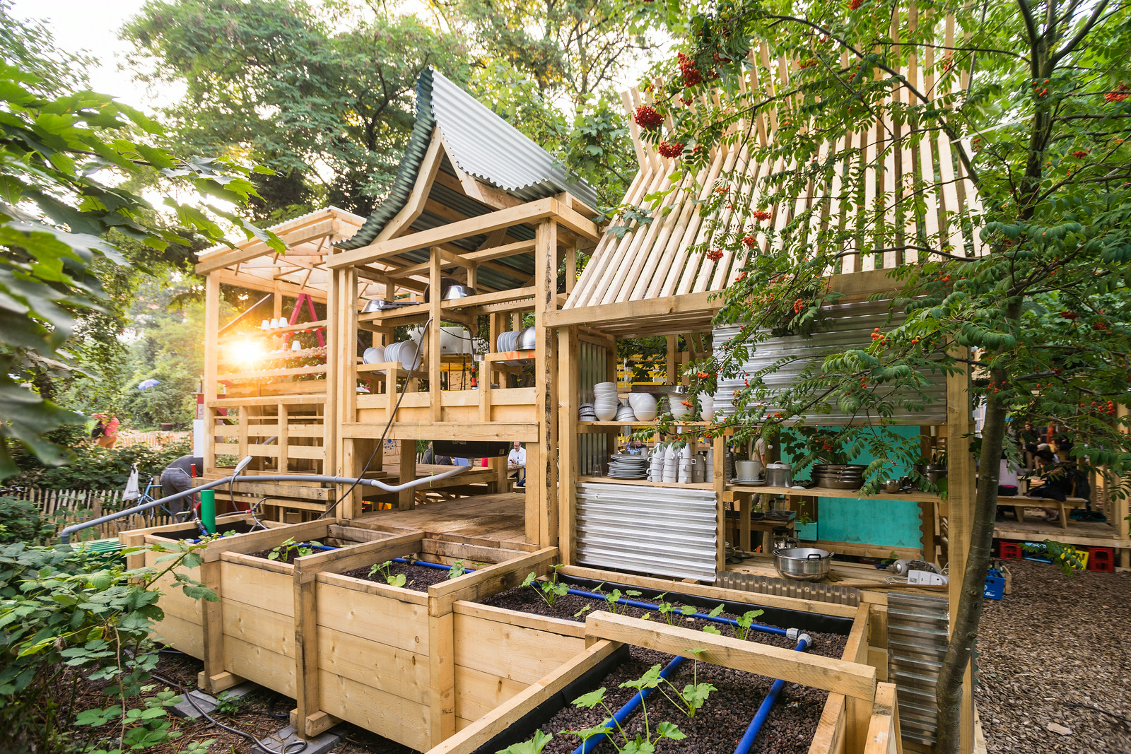 The "Osthang" is a small piece of natural growth in the urban area of Darmstadt. The temporary architectures blend carefully into the green space, integrate trees, respect living spaces in the ground and vegetation without sealing or devaluing them. The usage concept and the cultural formats always focus on conveying sustainability and the conscious, careful use of resources with a view to material and cycles. In addition to the use of natural resources, the focus here is on recyclability. By locating various content formats on the topic of sustainability and cycles, such as food sharing, clothes and plant swapping and much more, awareness of this is sharpened through community involvement. The community garden is watered by a plant-based sewage treatment system, the topic of cycles is deepened in discourses and workshops on site and implemented experimentally on various levels. The University Group Sustainability is continuously involved in projects and spreads the idea of sustainability just like the various project partners. Every offer on site (e.g. drinks) is checked for its closeness and the added value is conveyed in a playful way as a matter of course.