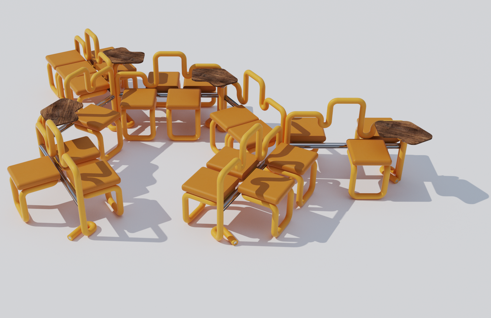 The peculiarity of the seat is that it is complementary to the metal structure, made up of standard modules which allows compositions that are always different, according to different needs. The 60° angle between each module creates hexagonal configurations, inspired by the shape of the honeycombs. The hexagon is, by its very nature, the geometric figure where the perimeter – area ratio is most advantageous. This configuration allows the creation of a larger space using fewer materials.