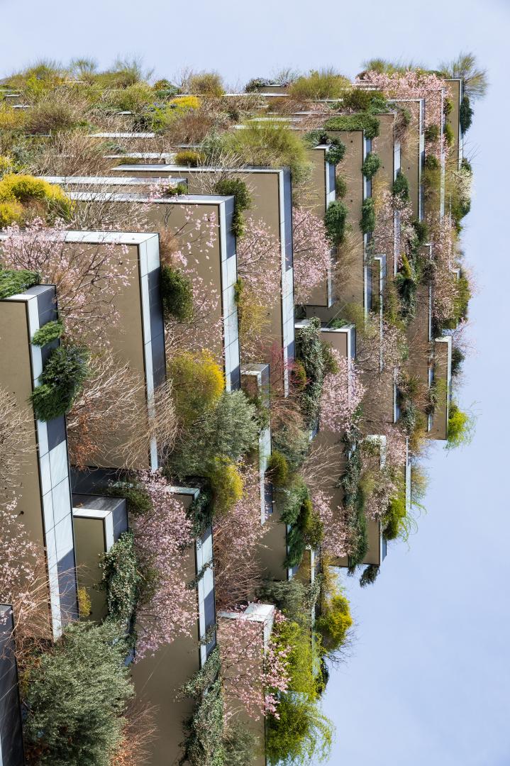 Bosco Verticale is the prototype building for a new format of architectural biodiversity which focuses not only on human beings but also on the relationship between humans and other living species. The first example, built in Milan in the Porta Nuova area, consists of two towers that are respectively 80 and 112 metres high, housing a total of 800 trees, providing an amount of vegetation equivalent to 30,000 square metres of woodland, concentrated on 3,000 square metres of urban surface.