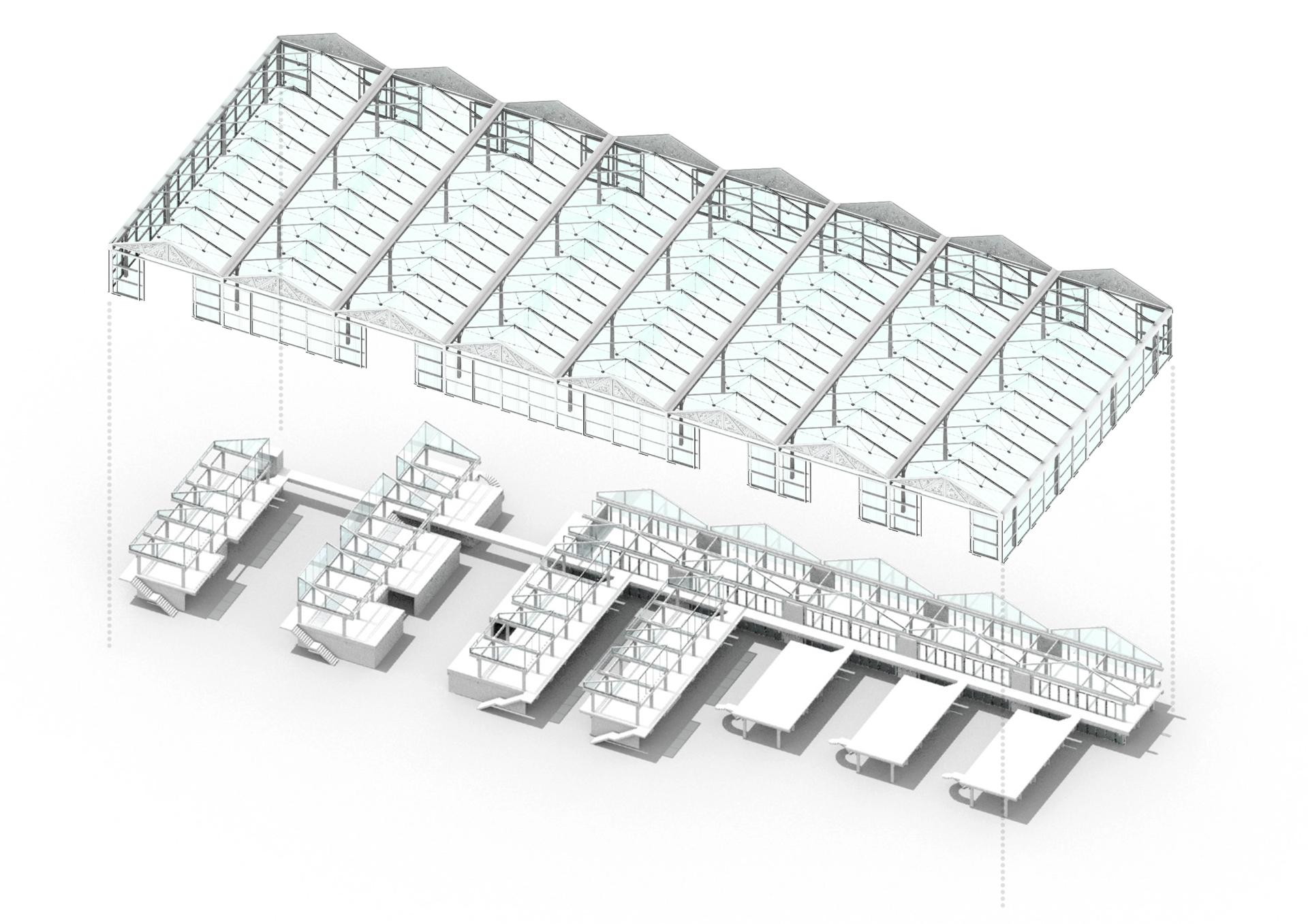 The polycarbonate cover and interior spatiality its meant to ease the temperatures in winter and allowed cross ventilation on summer. We find a winter garden area in each façade, as a green space inside the building this climatic buffer protects the inner structure from temperature variations and whether impacts.