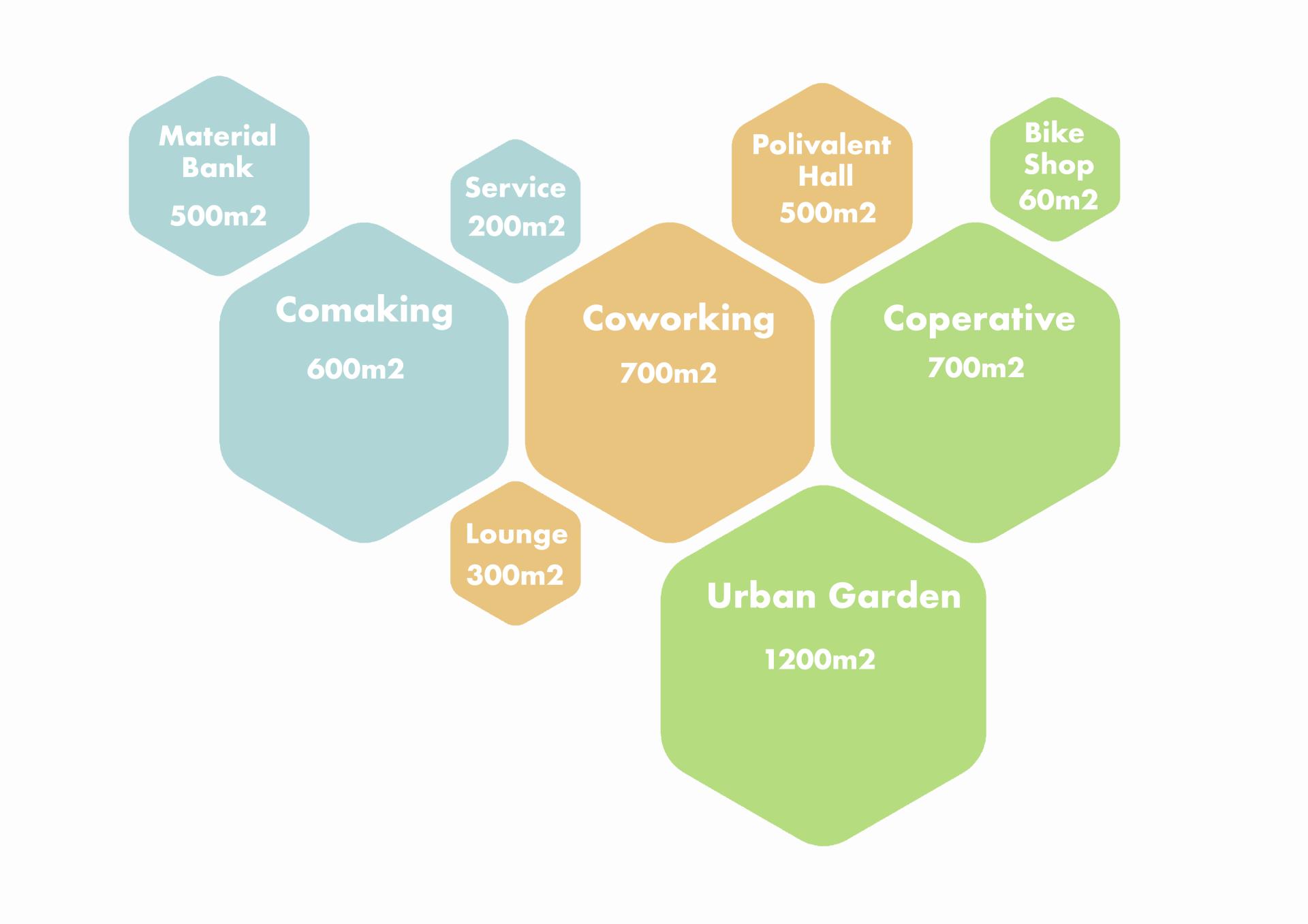 Thus there are three different functional parts that work together :The comaking area; where different artisans of different disciplines can work and share knowledge and tools. It includes a storage space and individual working units. The coworking area: Basically office spaces shared by the different collectives with common spaces, meeting rooms and services. It includes a Polyvalent hall and rehearsal and recording rooms for the musicians. The cooperative area; It is the core of the project. Where the administration, social gatherings, urban gardens and evens take place. It’s the most open to the public part of the building opened to both sides of the city. It includes a temporal residence a Bike shop and the Paneik Bar.