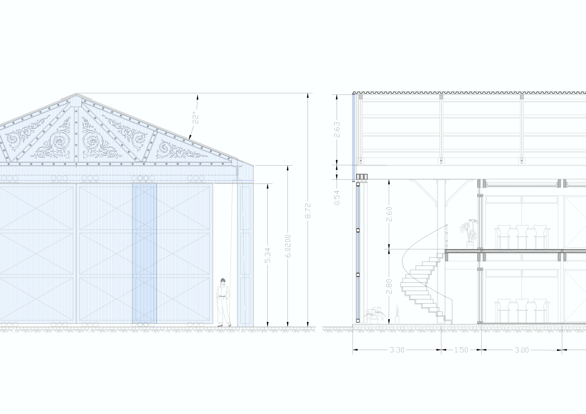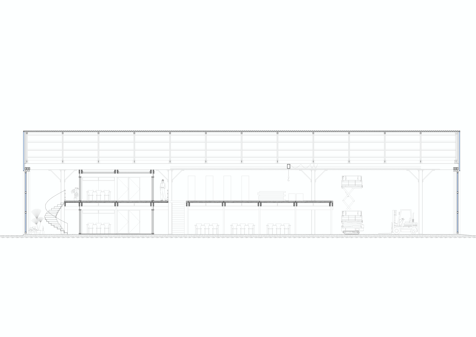 The existing use of the space is completely done with recycled materials and a circular and sustainable methodology. The space serves as a big interprogramatic covered space where different activities related to arts are being developed. From a concert and recording room, a bar and terrace to a welders workshop. The project reorganizes all this activities while restoring the existing iron Warehouse and improving its climatic performance.