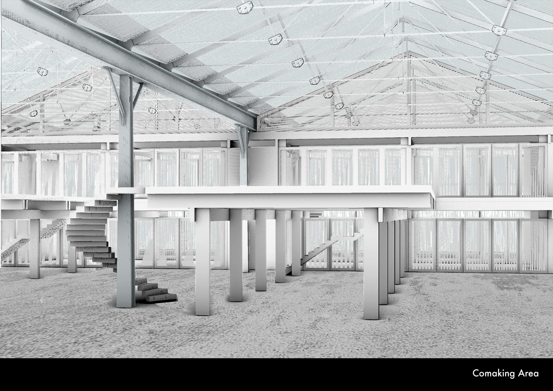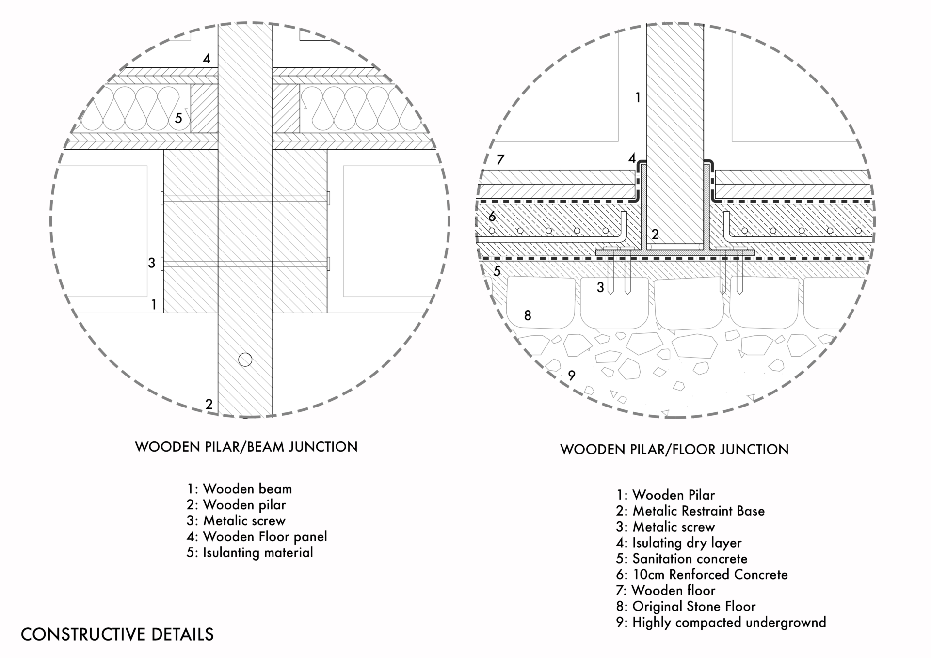 The composition of the space consist in the three areas early mentioned linked together by a circulation spine and two façade open corridors. Each working unit is adequately isolated. The lower floor has the wet services and the climatized rooms. The structural configuration of the additional structure is a timeless and simple solution. Two beams attached to a Pilar with screws and a wooden floor. The foundations of these structure are already set in the highly compacted ground below the Warehouse, due to the constant heavy transport of the former industrial area.