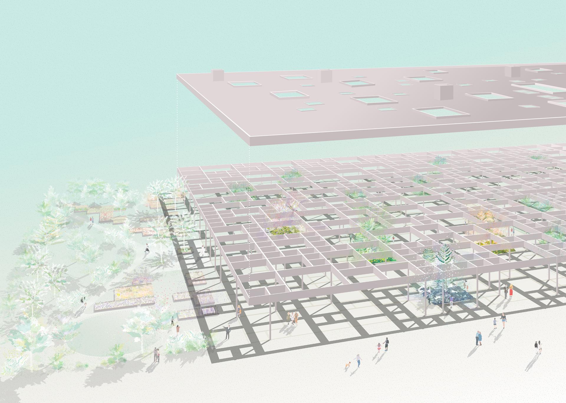 A systems design approach that introduces breathing into buildings. Here smart misting technology enhances or “augments” the evapotranspiration of the plant-communities that inhabit the 13 courtyards.