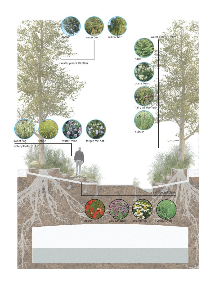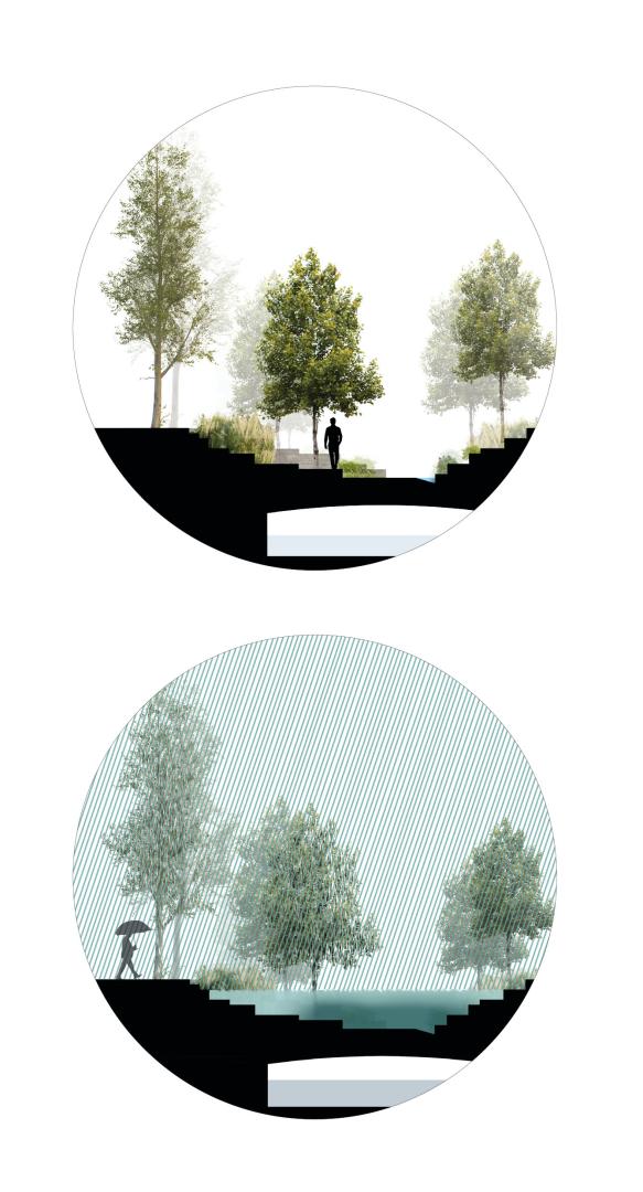 In absence of rain, the “river” retreats and allows people to live in its bed, a green infrastructure that connects Niguardia with the city center. This linear ecosystem has the features of a natural river (banks, vegetation, water), composed by a continuous path and a system of resting areas (“wet areas”) designed as public spaces for meeting, sharing, and experience the river.