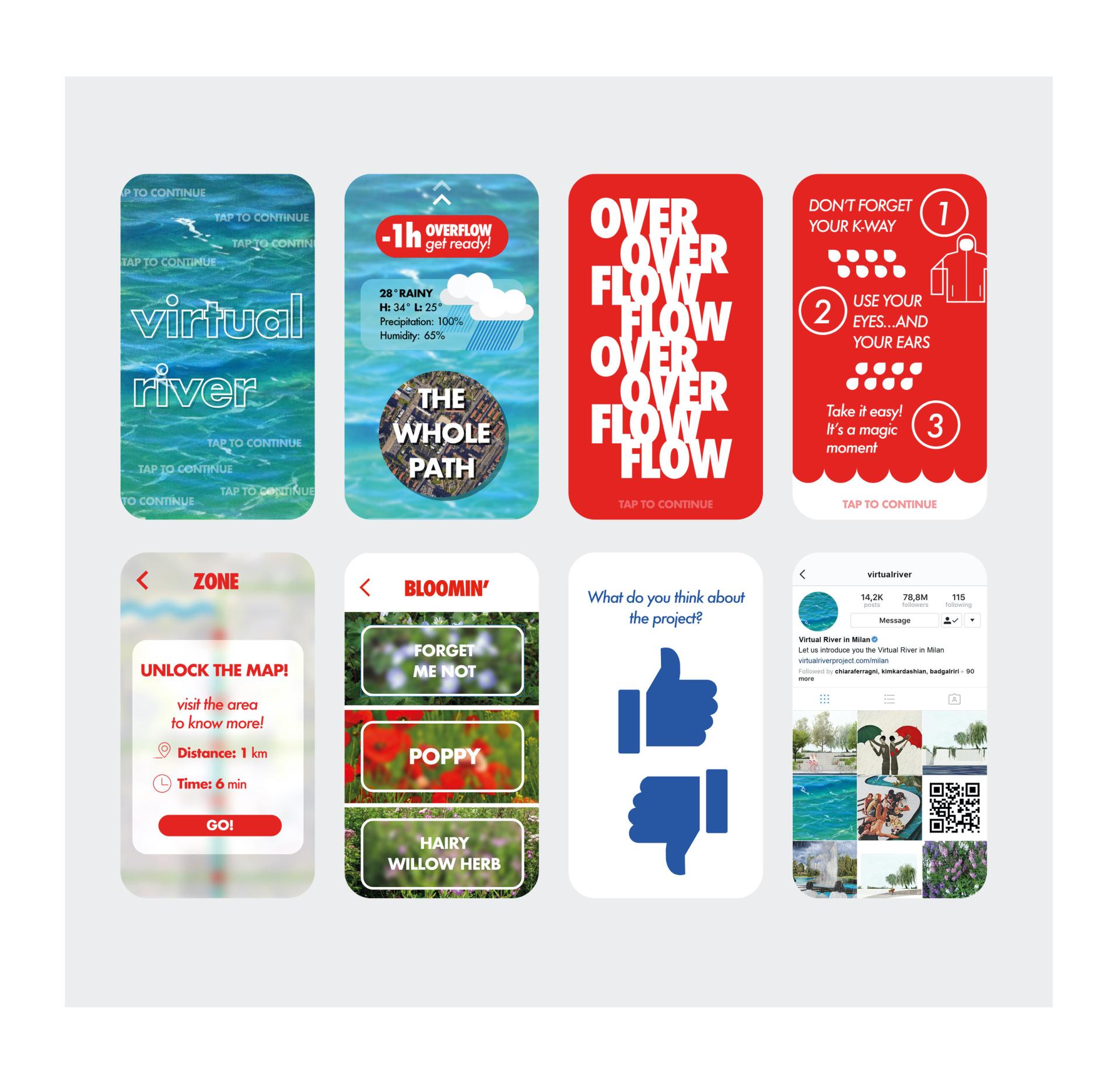 The concrete and tangible experience of the Virtual River is enriched by the dedicated app, an important tool for creating interest: it provides a countdown for the overflow (that is transformed by the project in a spectacular event to attend) and it signals the various activities, art installations, shows and events that characterize the virtual river in some focal points and provides information on the different types of vegetation and seasonal blooms.