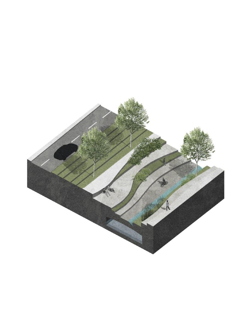 The concept of the Virtual River allows us to build the place for the manifestation of the river, that is also a new linear public space for the city, and at the same time it represents an ecosystem service that can collect the rainwater and slow it down before it meets the river and avoids. It is a metabolic action that simultaneously provides a spatial, technical and aesthetic solution.