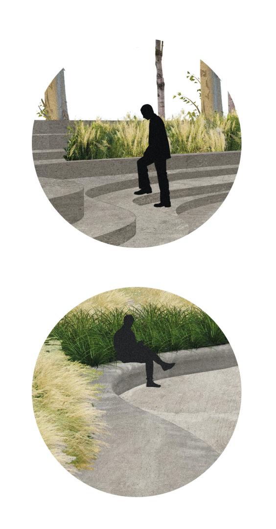 In absence of rain, the “river” retreats and allows people to live in its bed, a green infrastructure that connects Niguardia with the city centre. This linear ecosystem has the features of a natural river (banks, vegetation, water), composed by a continuous path and a system of resting areas (“wet areas”) designed as public spaces for meeting, sharing, and experience the river.
