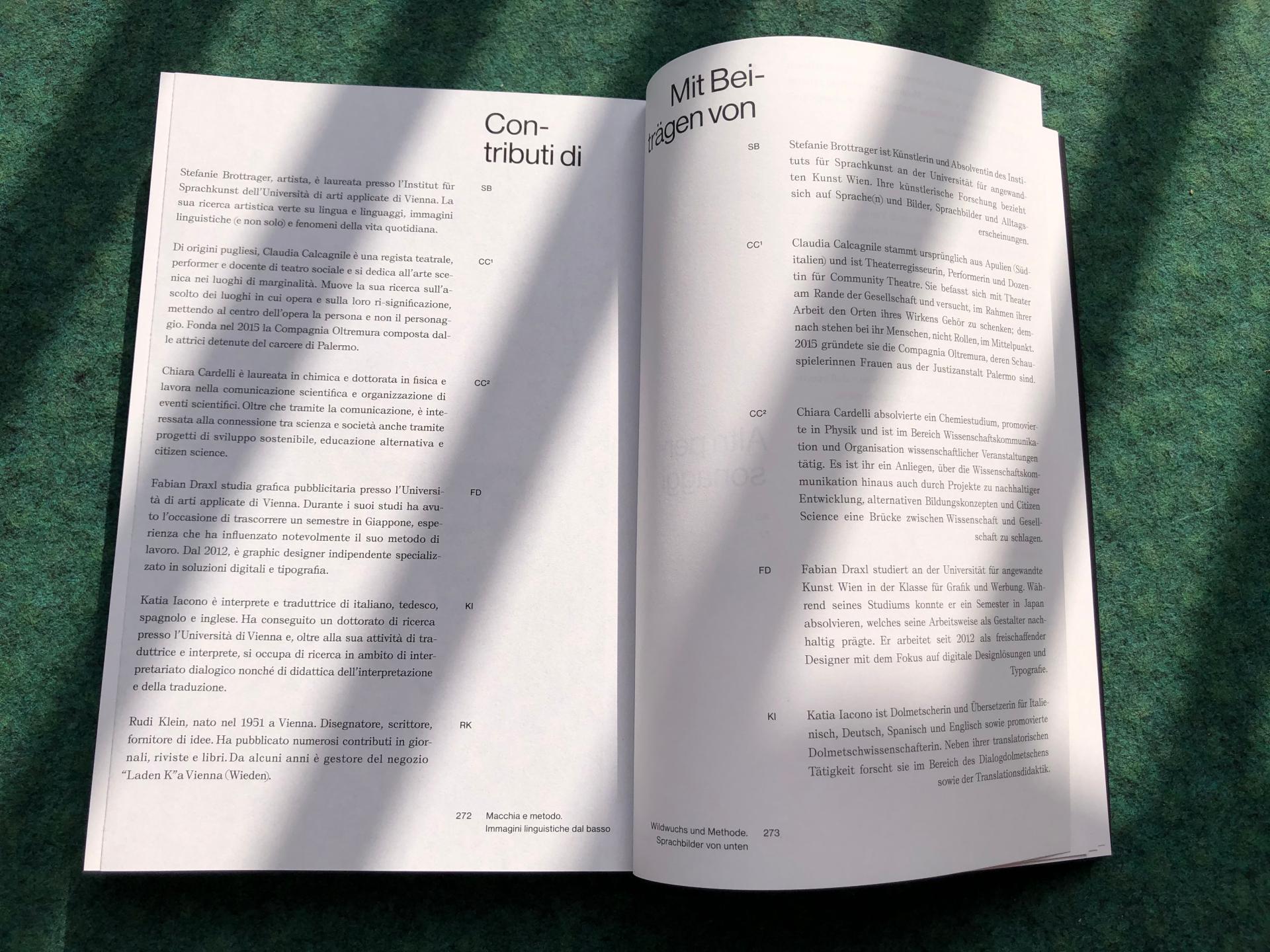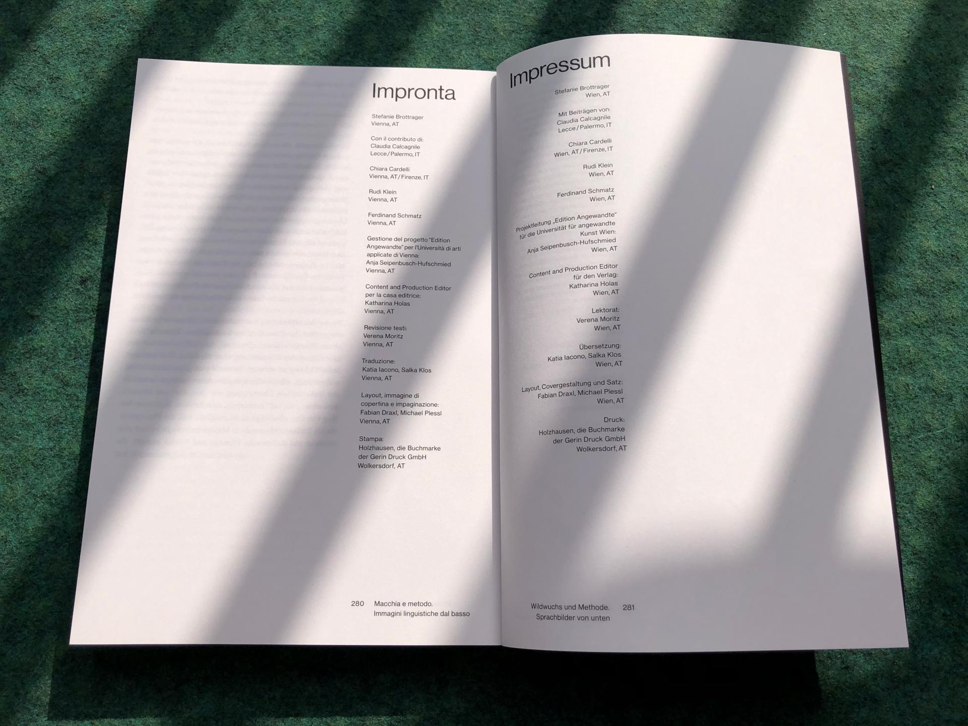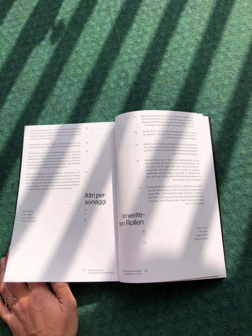This publication has its roots in the Capital of Culture Matera Basilicata 2019 (Italy) and Vienna (Austria). An internship at the Open Design School resulted in a bilingual book that gives new shape to both the visual and auditory force of intercultural dialogue. Language art, everyday language (Italian and German), design and cultural practices not only translate one language into the other in this volume, but also practice a new expression of plural authorship.