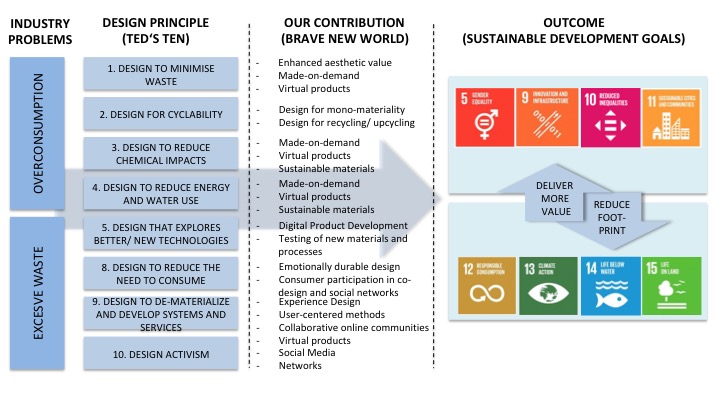 BNW business model actively works towards a more sustainable fashion industry (see Image 1). The sustainability strategy is derived from the elements that present major problems in the context of the textile and apparel industry: a) lack of transparent business processes and b) overconsumption leading to unnecessary exploitation of resources and excessive textile waste. While addressing these industry-specific problems, the outcome can be reflected more clearly in the Sustainable Development Goals (SDGs). Eight of the STGs are taken into consideration, that are feasible to be fully reached or positively impacted by BNW’s innovative business processes. BNW has a design-focused business model and therefore offers a distinct product development process and products. Therefore, the basis for decision in the sustainability context is the TED’s Ten, as proposed by Mistra Future Fashion. As sustainability already starts in the design phase and the design phase is the core of the business, applying this concept as part of the sustainability strategy is a suitable approach for Brand New World. For the sustainability strategy, the goals are divided into two sections according to their outcome: value addition and impact reduction.
