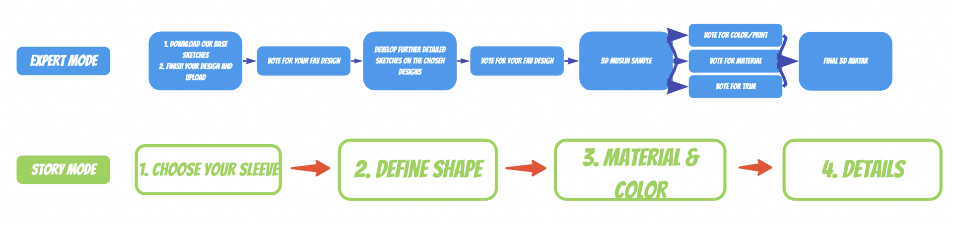 Further, the platform is accessible and inclusive as it takes different skill levels into consideration. Participants can choose which part of the process they want to be involved in, some might be more comfortable with only creating moodboards and color palettes, while others might use the platform to train their sketching skills. For participants with no prior experience in fashion design, a virtual 3D design environment is provided. In this workspace, it is possible to design garments in real time by changing dimensions and moving/adding details