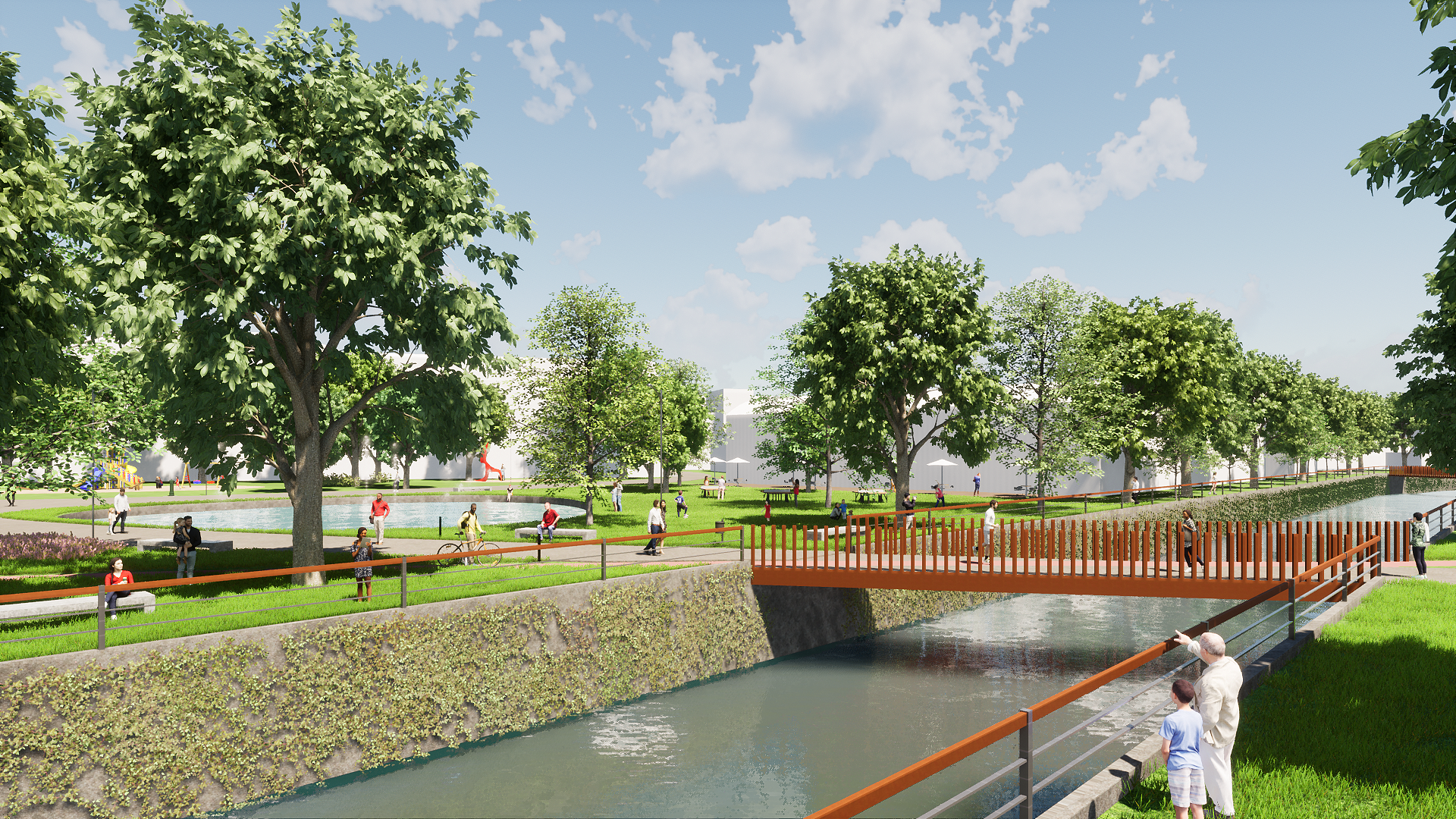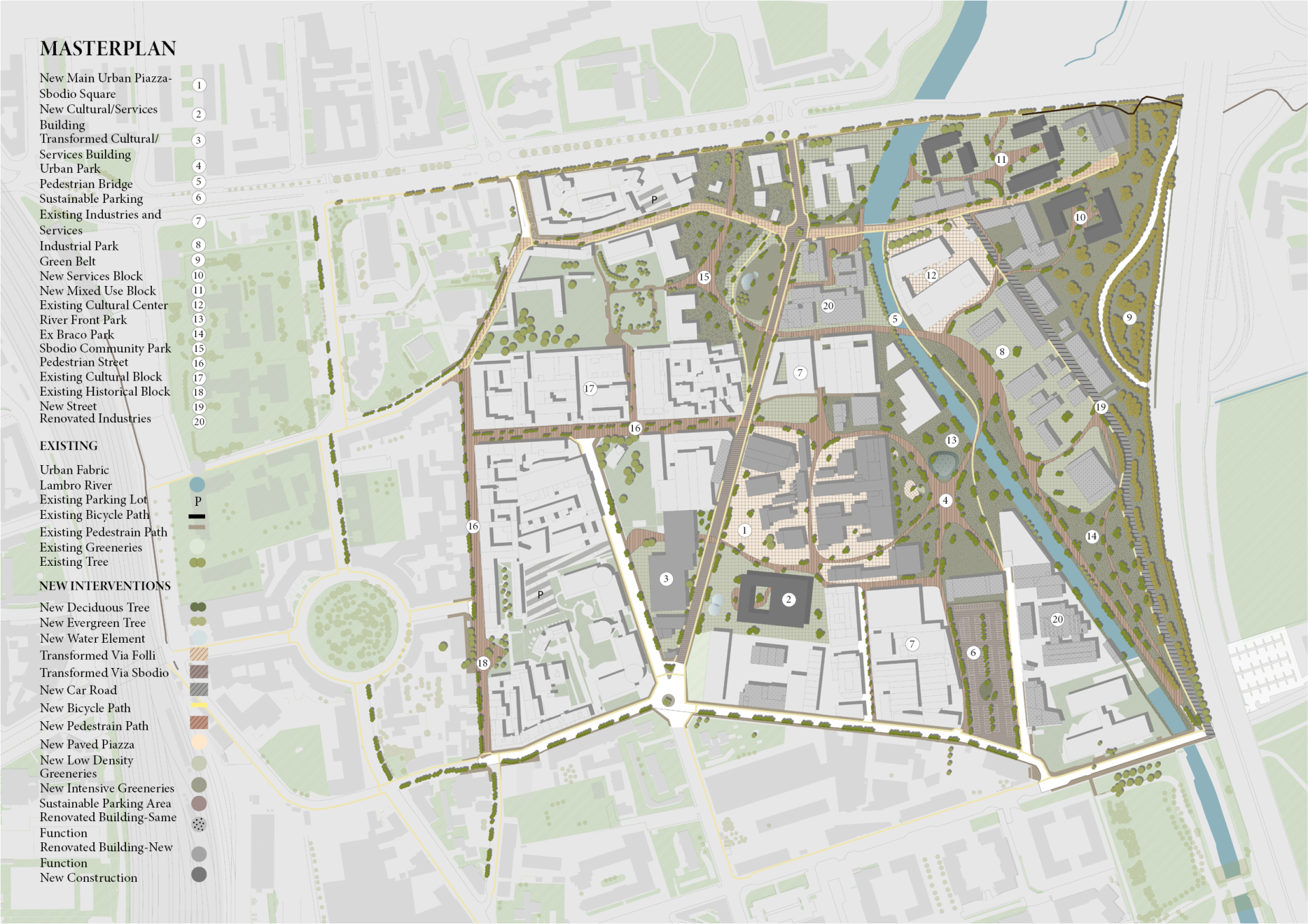 We aimed to implement homogenous elements to make the whole intervention unified, we put permeable pavements in the pedestrian paths, moving all over the site, to make the whole plot accessible for the pedestrian. Various types of trees are implemented in the site with different functionalities: Maple, Chestnut, and Linden in the streets and squares, and Catalpa and Willow near the highway and riverfront. Water elements are proposed as design tools for the public space. Green rooftops are proposed in new and renovated buildings. Pedestrian and bicycle bridges are designed over the river to connect the new park with the renovated industrial development. Urban furniture and other resources are provided to facilitate the permanence of people on the site. Internal public places (inside or between buildings) are linked by the squares and have mostly green space inside of them.