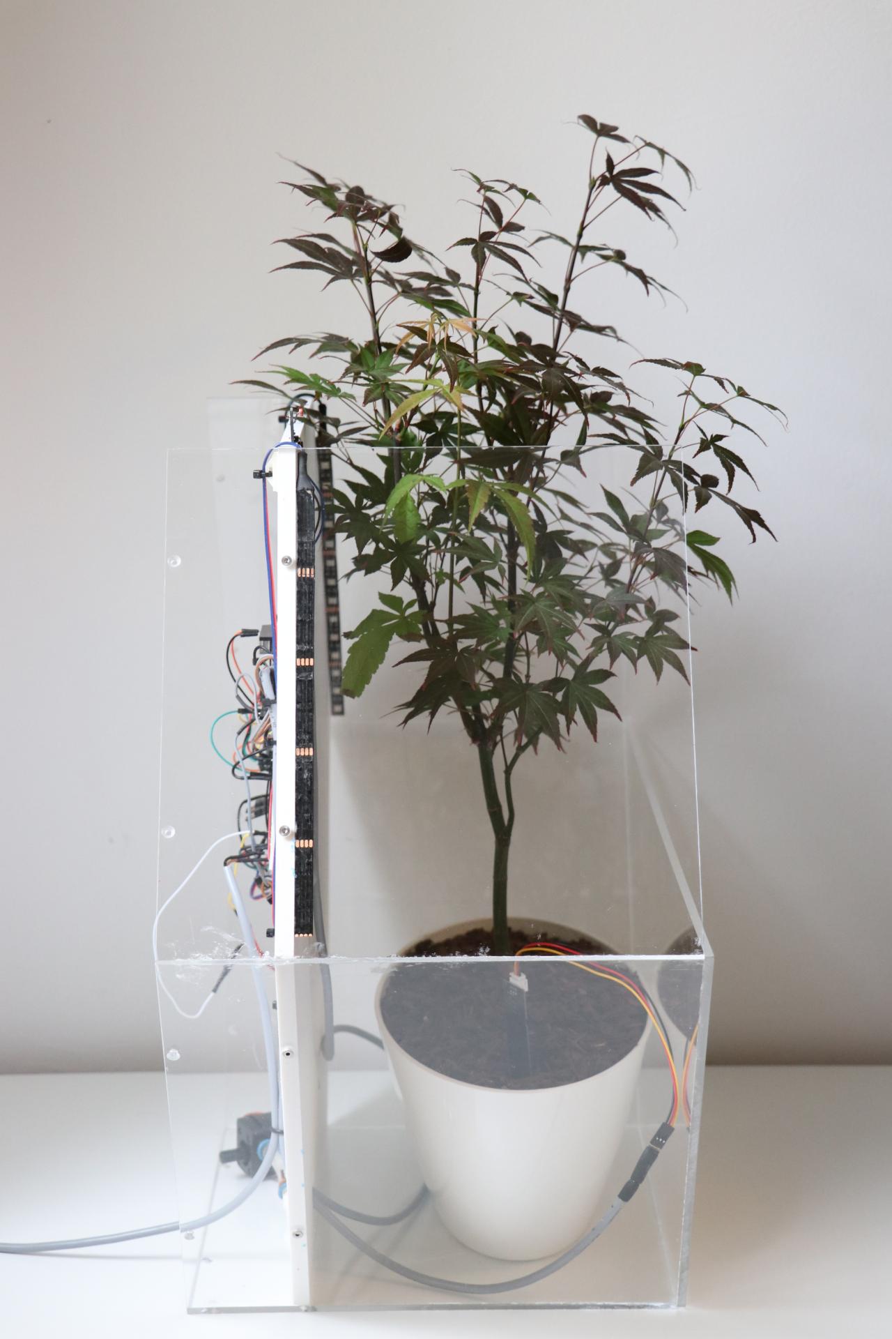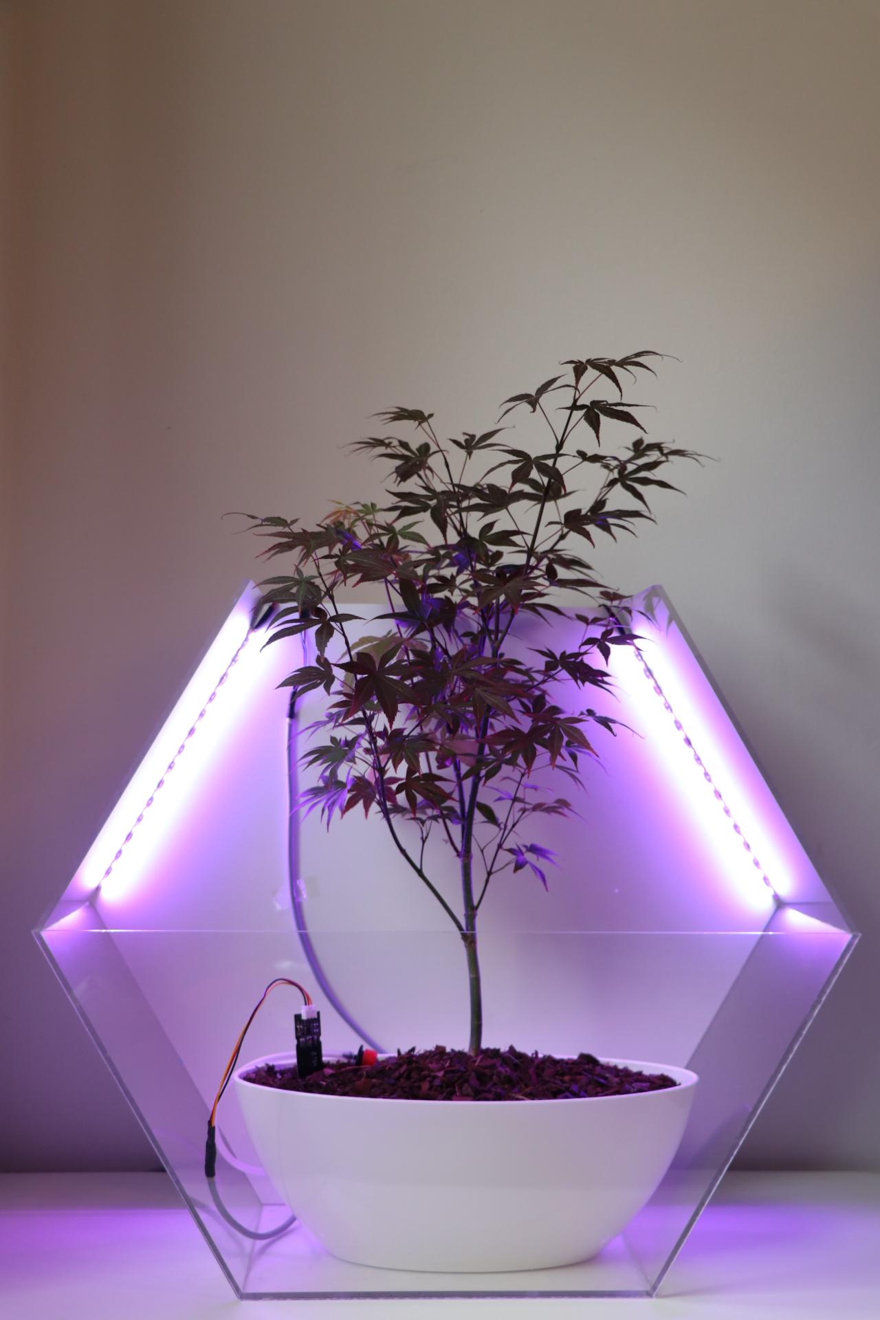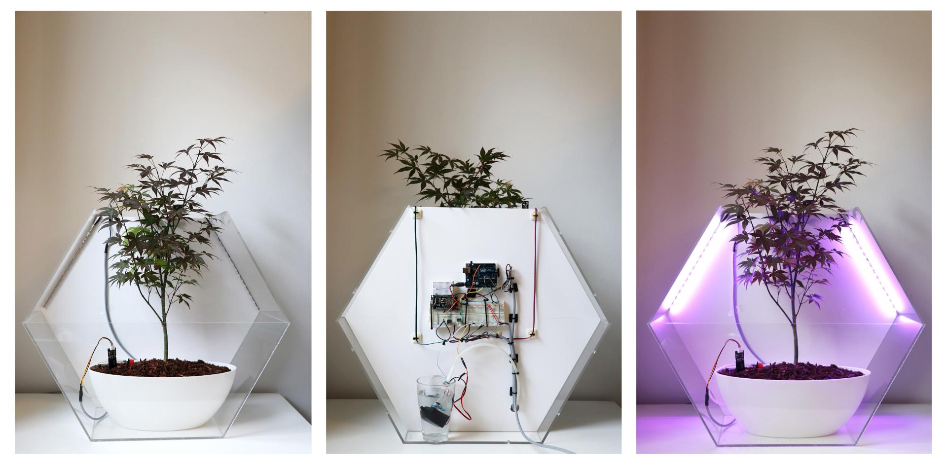 It is a smart plant stand. Each smart plant stand module possesses an Arduino Uno, which is a microcontroller, LED grow-light, and water pumps. There are light sensors and moisture sensors, which analyse if the plant needs more lights and water, respectively. The energy for turning on LEDs and the water pump comes from the transparent solar cells that are provided on the sides of the box. The connection between all of these elements is based on IoT Technology and without the interference of humans.