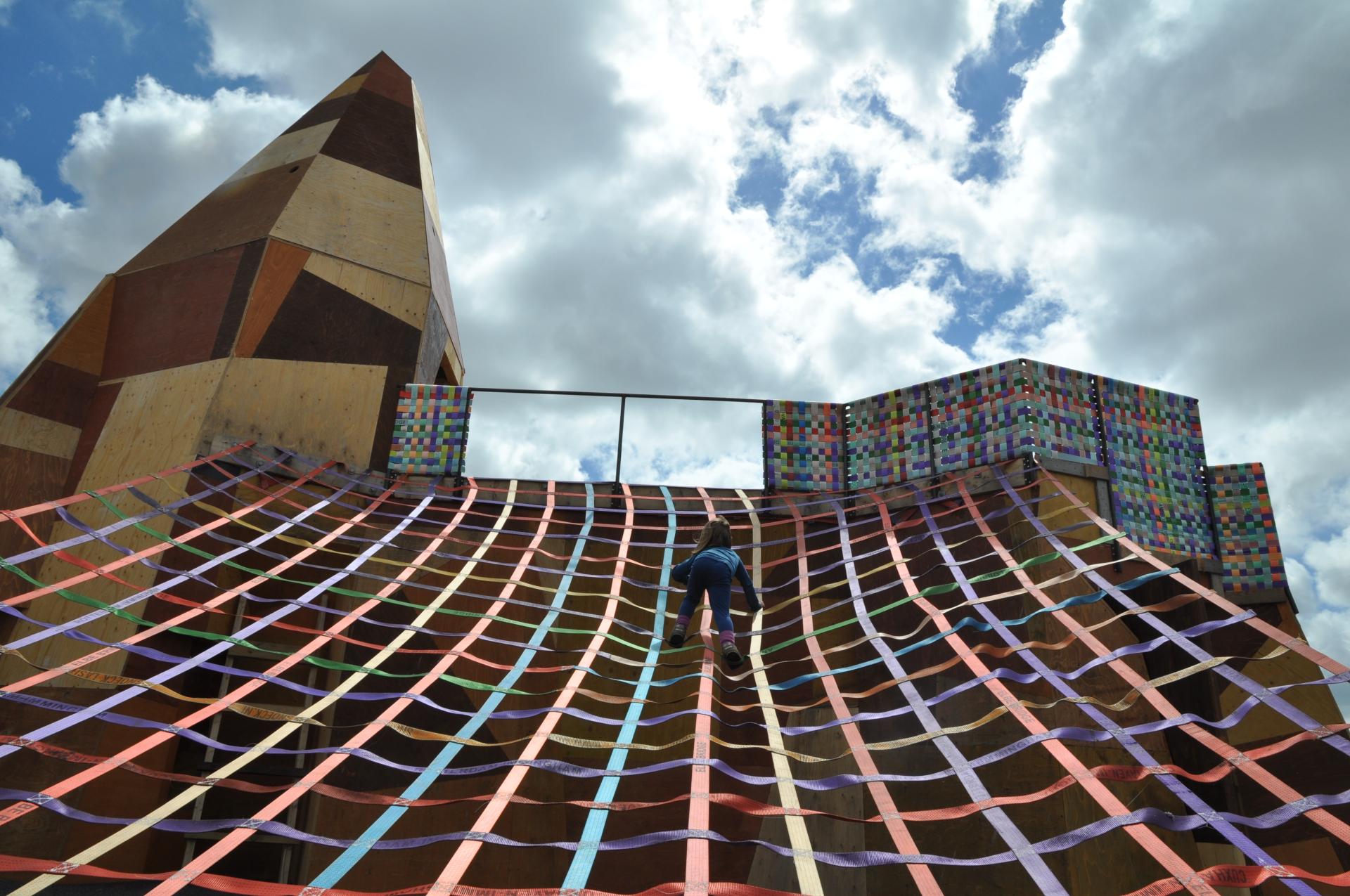 Craftsmanship, art, and design has been in the core of the project from day one whether constructing a sauna or constructing the what we call relational architecture (inclusion). The invited actors where asked to investigate the site-specific potential and to identify qualities for `Jubileumsparken´ as a part of the post-industrial landscape. Working with recycling and environmental sustainability has therefore been done by identifying the existing values on site end re-using material as much as possible. The public sauna, designed by Raumlabor Berlin, was constructed on an old concrete slab in the river, previously used to anchor boats. A choice made to enlighten the cultural values of the landscape. Facades for the changing rooms where made from 15 000 recycled bottles and playing nets for the play mountain, the prototype for art to act as a playground by Akay and E.B Itso, was for example made from straps from containers.