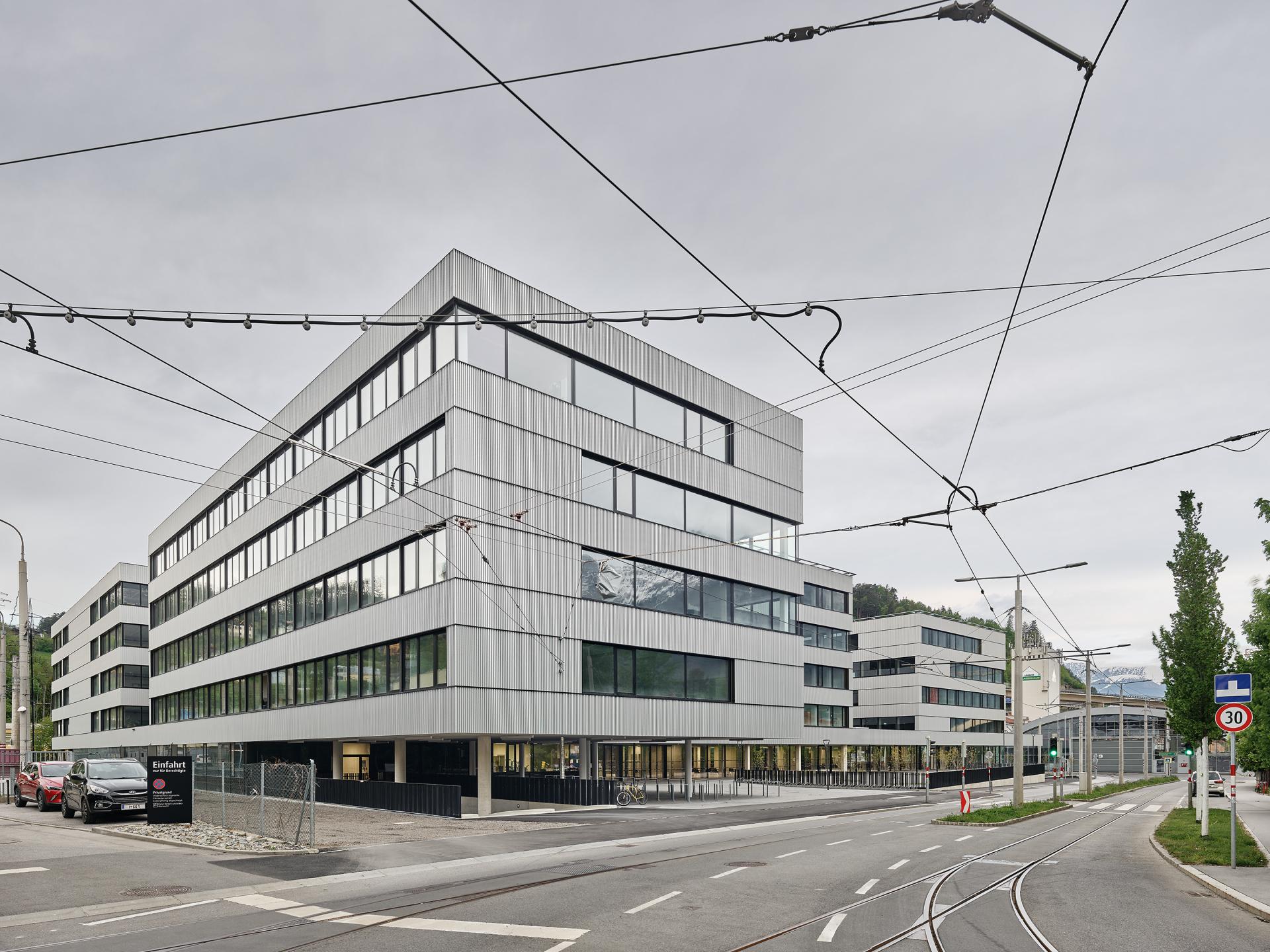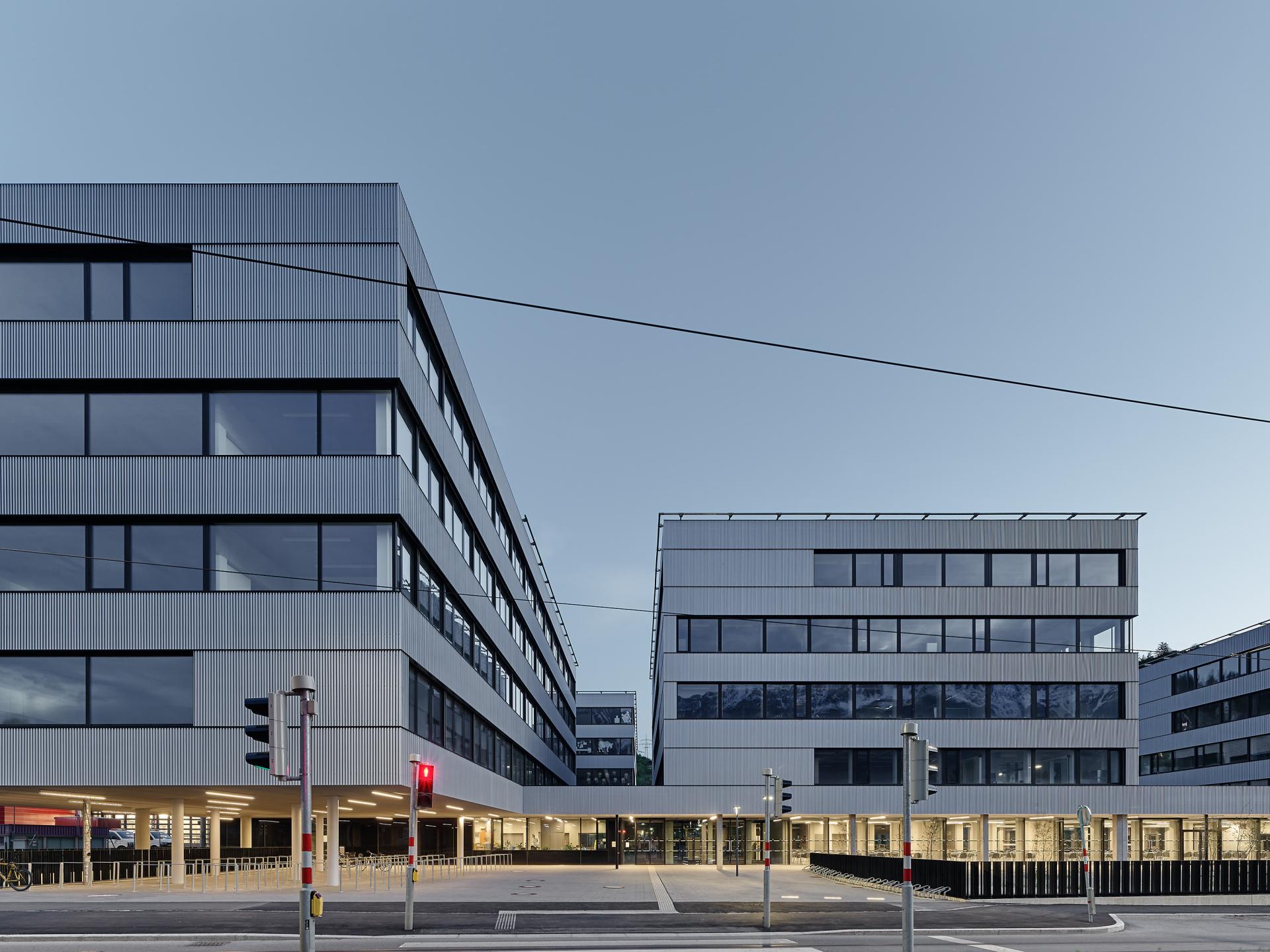 The PHT building is located in an urbanistically rather inhospitable outskirts of Innsbruck surrounded by industrial buildings. The aim of the project was for the university building to assert itself in this environment with a clear and modern architectural language as a public urban element and to enhance the neighbourhood with its long-distance effect.