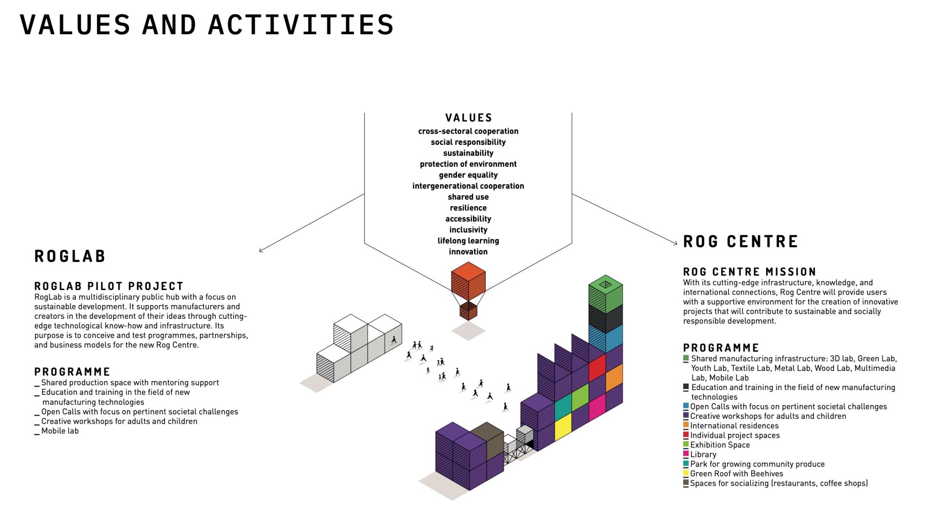 The RogLab pilot was designed to test the outcomes of these processes on a small scale: the programmes and a participatory management model that can be used for the new multipurpose hub named the Rog Center in the once renovated factory.