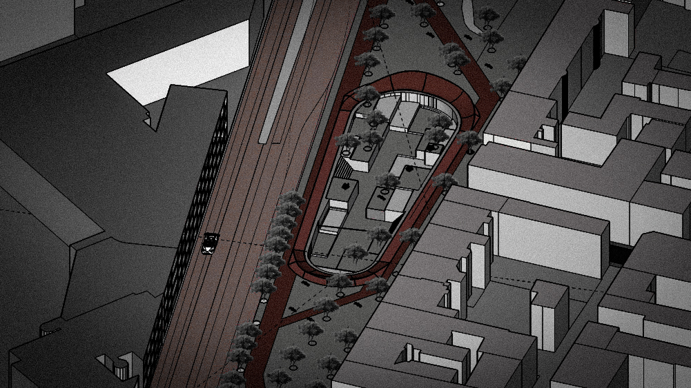 This project aims to blur the line between function and form, through the creation of new paths, particularly by giving priority to pedestrians and cyclists. A route from north to south and another from south to north which in the center meet to form a velodrome in the city, open to the public and inviting to play sports.