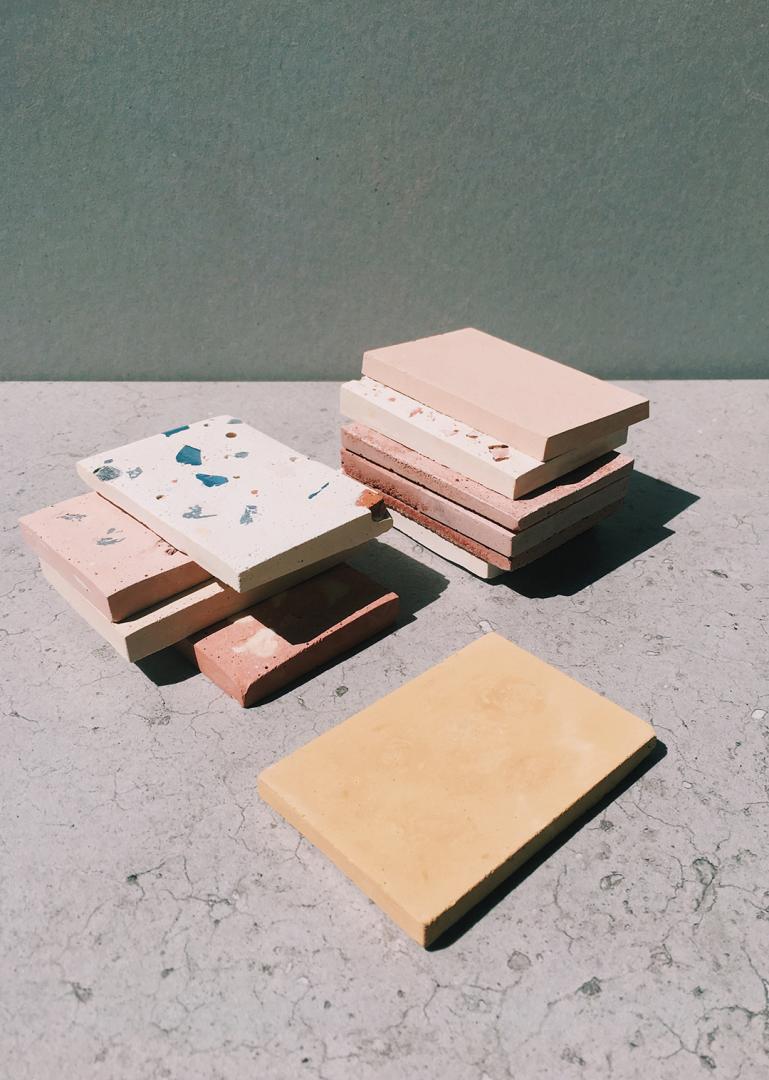 Therefore, the material collection is inspired by local constructions, with a combination of pastels and rich ceramic colors. It shows traces of its past history, with a contemporary look and a warm color palette defined by the natural pigments of the construction waste. It is a material intended for facing, exposing its surface to communicate its message—a creation of beauty made out of waste. It wants to make waste desirable by celebrating the Mediterranean identity and embracing imperfections, through the aesthetic and tactile experience of materials.