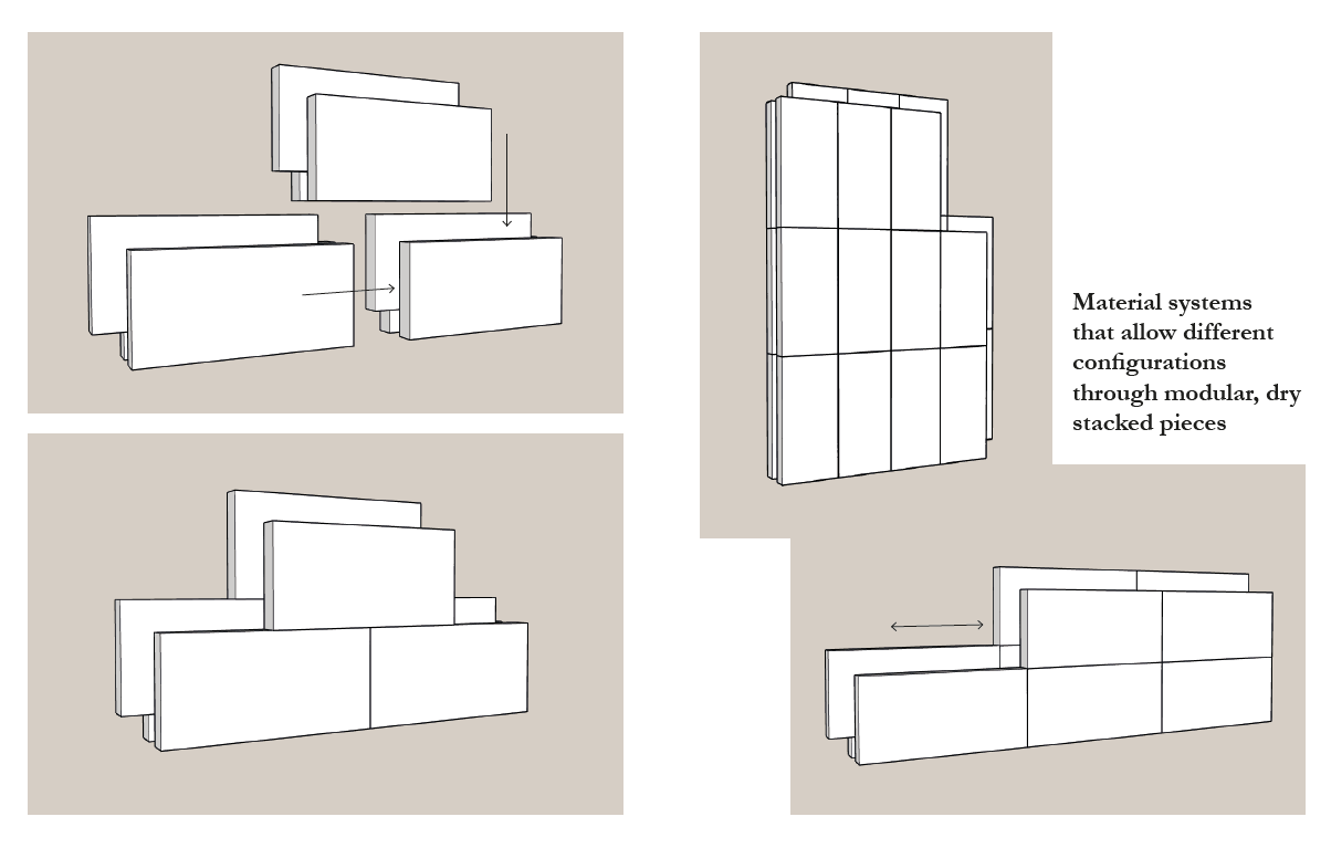Besides the creation of new materials from waste, the project also explored the possibilities of creating material systems based on modularity and the concept of Design for Dissasembly, to promote the reuse of the materials at the end of their use cycle, to maximize material efficiency and to facilitate building deconstruction processes.